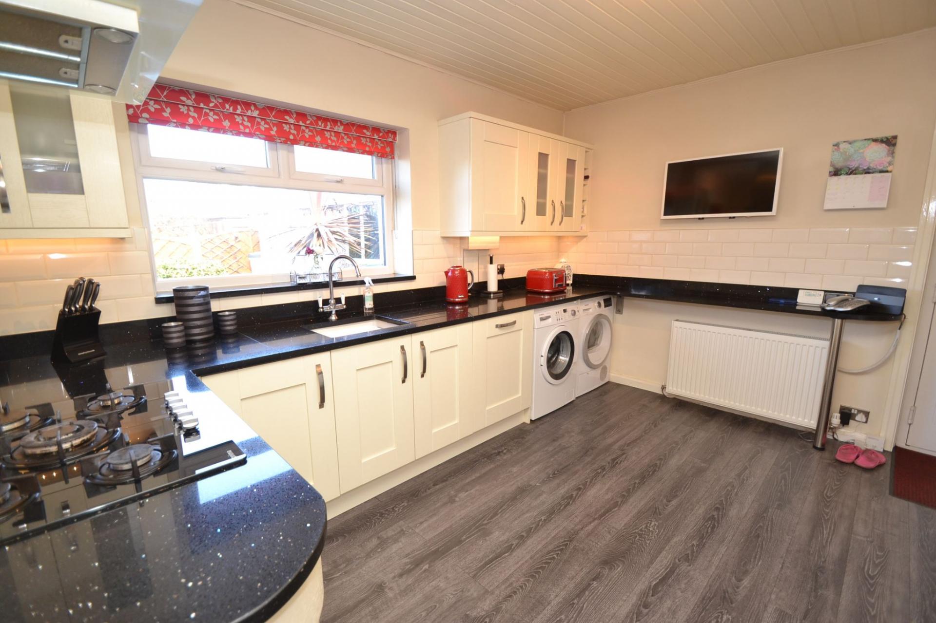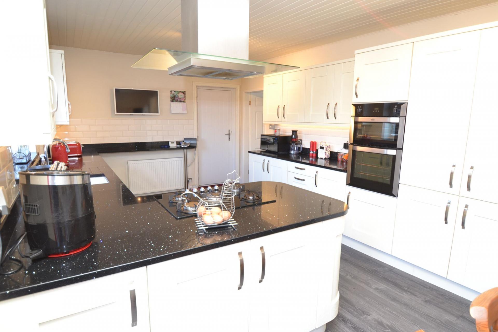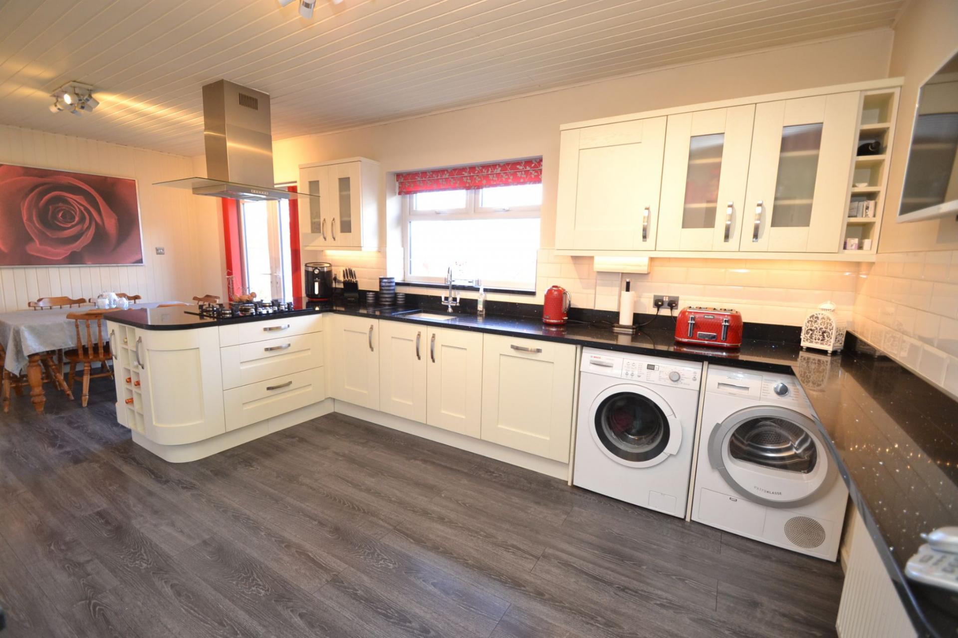 Open Plan Kitchen Dining Room: 6.63m x 3.49m (21'7 x 11'4). Excellent range of wall & base units with sparkly granite work tops and matching splash backs, brick effect tiling in white above, integrated dishwasher, plumbed for an auto-washer and dryer, sink with a mixer tap, breakfast bar, radiator, Upvc dg window to rear, 5 ring Prima gas hob and stainless steel extractor light & hood over, integrated Belling electric oven and grill in stainless steel, space for a tall boy fridge freezer. In the dining area is a space for a table and 6 chairs, Upvc dg French doors to rear, radiator.