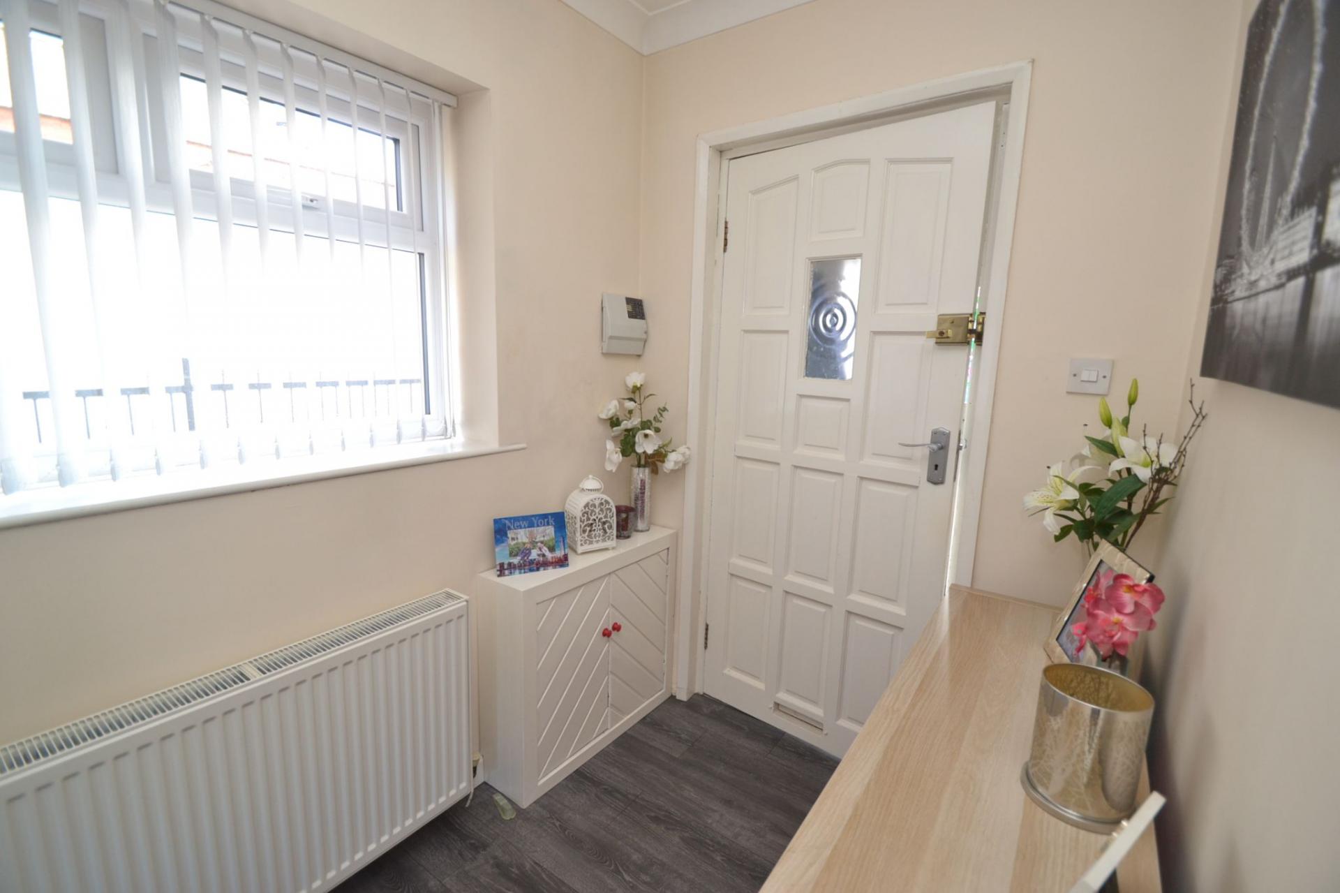 Entrance: Upvc door into the initial vestibule, Potterton Titanium condensing boiler, feature porthole coloured leaded window, internal door leads into the hallway, side Upvc dg window, alarm panel, radiator, quality laminate flooring, coving.
