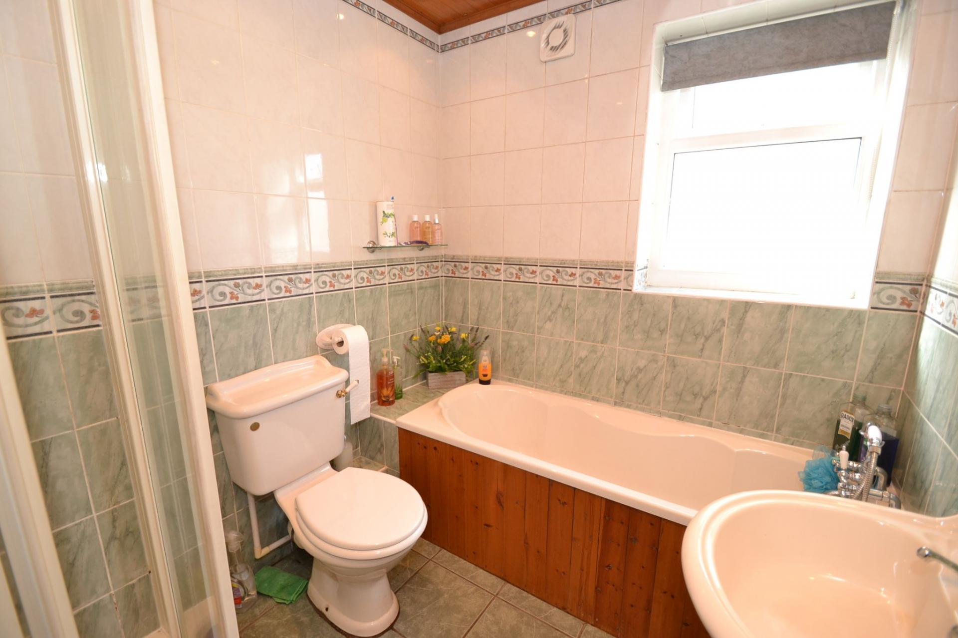 Bathroom: 2.23m x 1.92m (7'3 x 6'2). Four piece suite which includes a separate shower cubicle with a Mira 415 shower, full contrasting tiled walls, frosted Upvc dg window, pine cladded ceiling with inset ceiling lights, heated chrome towel rail, tiled floor.