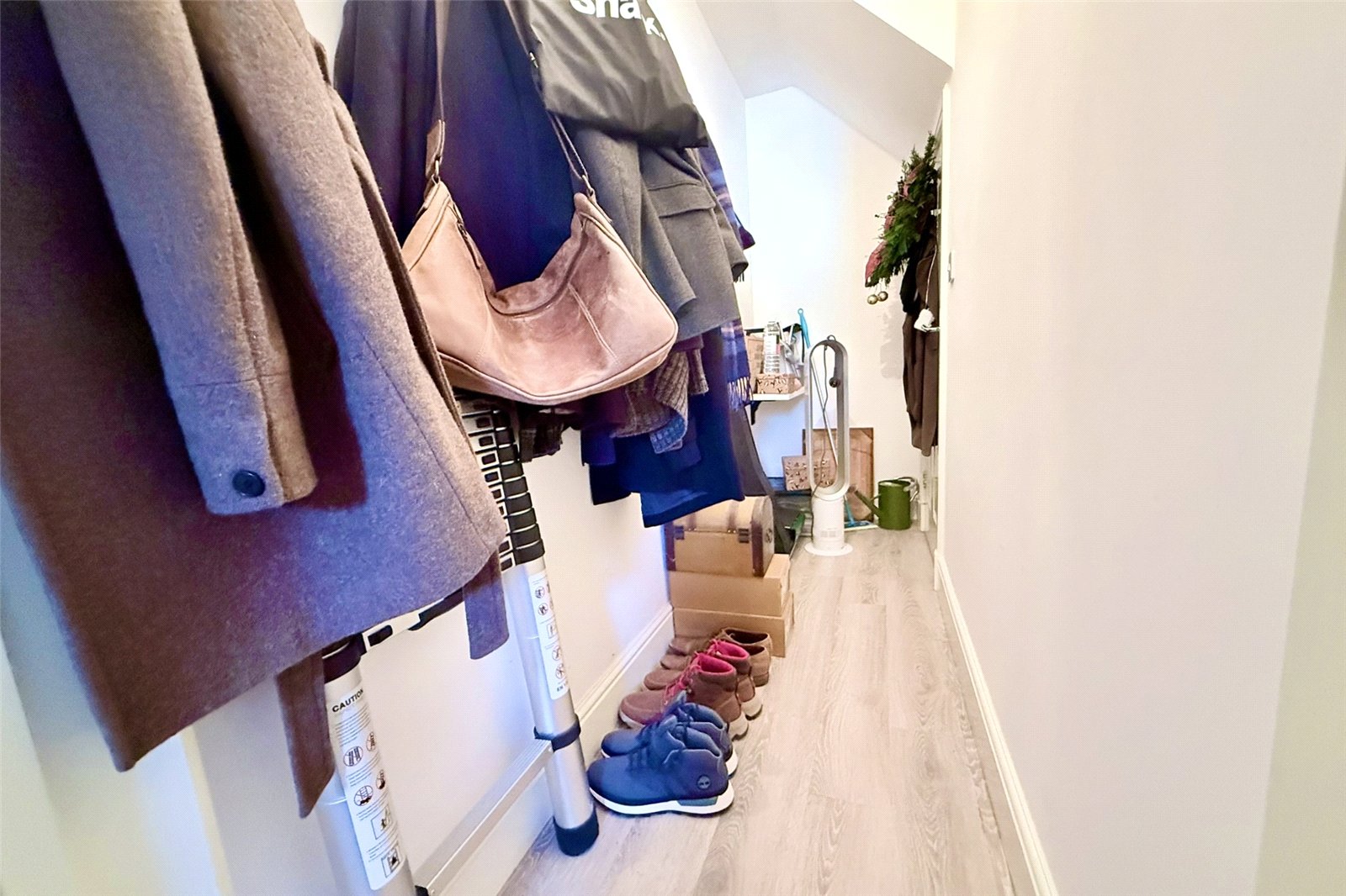Internally the property initially welcomes you with a large entrance hallway with access to an extremely spacious under stairs storage cupboard, perfect for coats and shoes. The current owners utilise the space for a further fridge and extra shelving. Upstairs, you will be pleasantly met with a bright hallway, leading to two double bedrooms, one of which is currently being used as a study. There is a good size bathroom, and finally, a large living area which opens up to a well equipped kitchen, again, with lots of natural light.