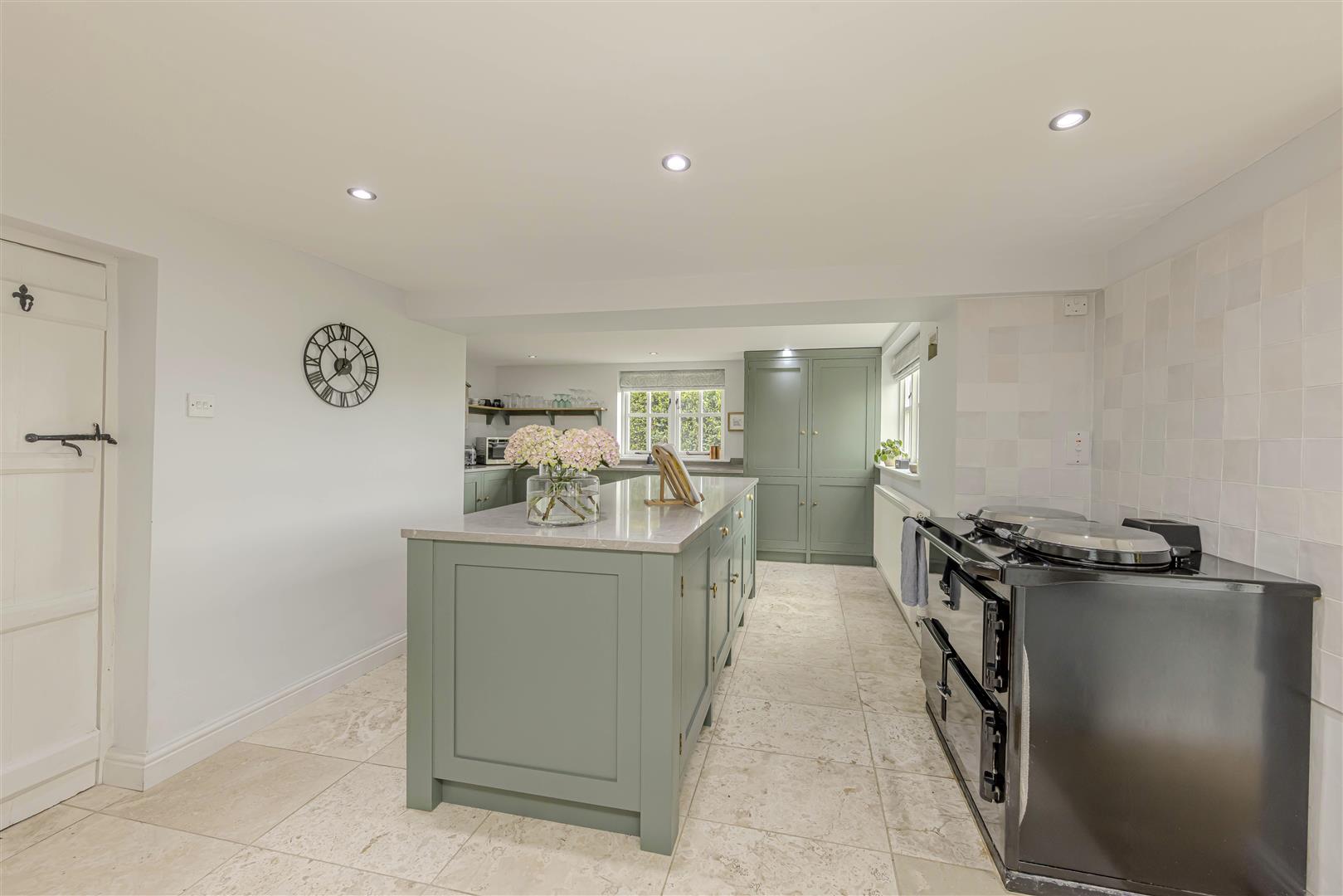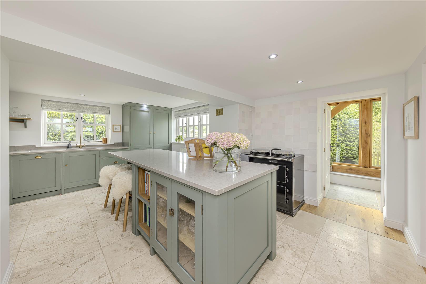 - Shaker-style kitchen with central island, quartz worktops and integrated appliances