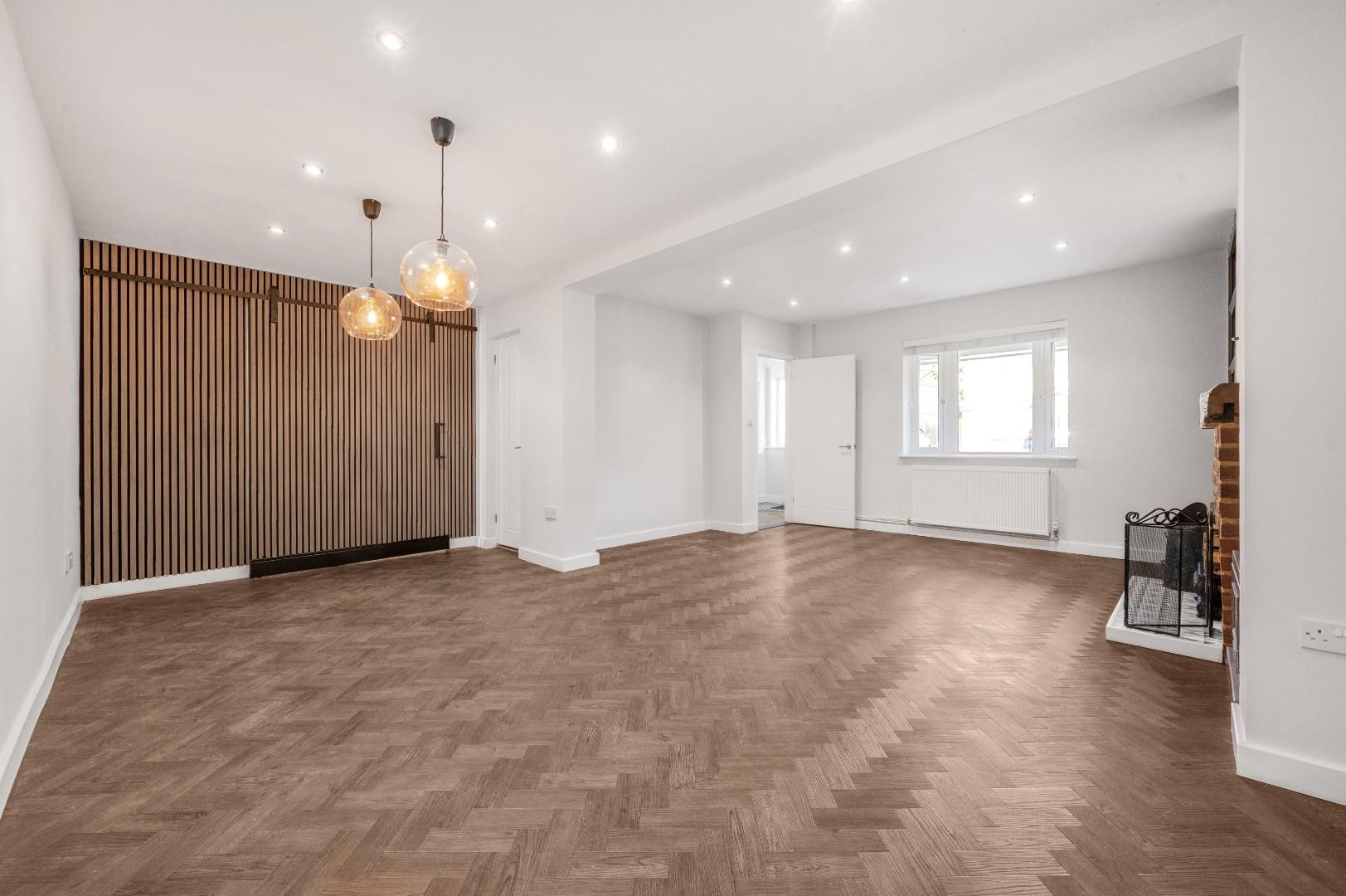 Family Room/Bedroom Four - 5.59m x 1.96m (18'4" x 6'5") - UPVC double glazed French doors leading to the rear garden, wood panelled feature wall, radiator, inset spotlights, herringbone style Oak flooring, T.V point.
