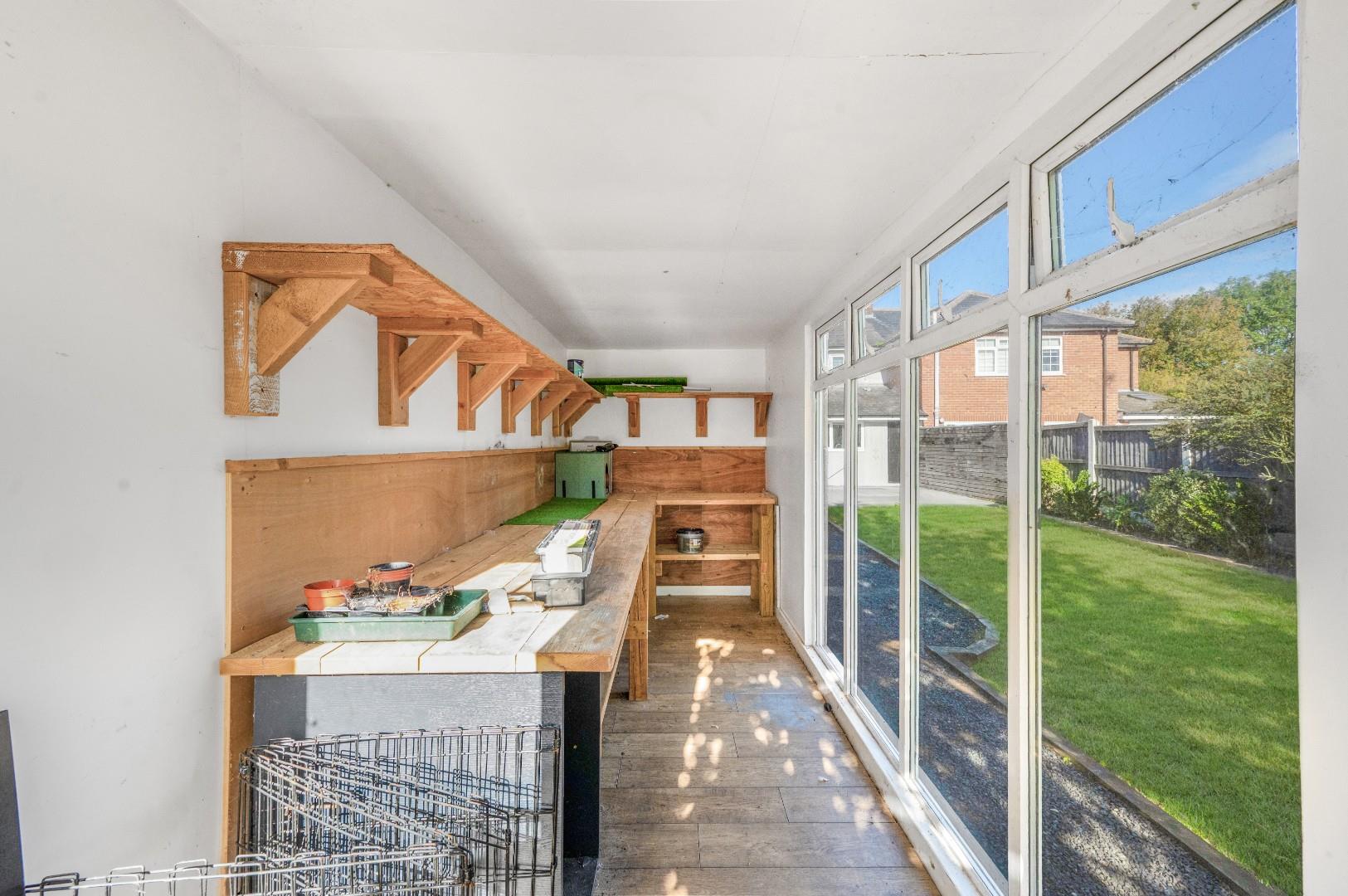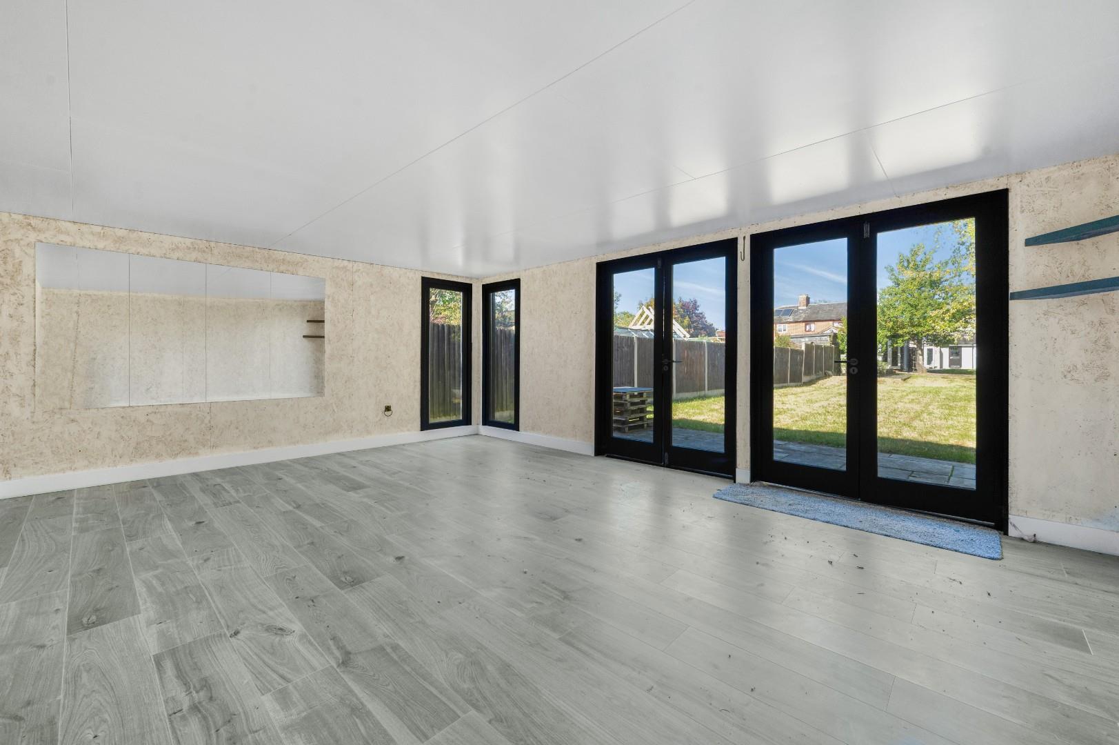 Home Office - 4.60m x 1.83m (15'1" x 6') - Situated halfway down the garden is a timber frame, insulated and cladded outbuilding with wood effect flooring, UPVC double glazed full height windows and UPVC double glazed French doors.