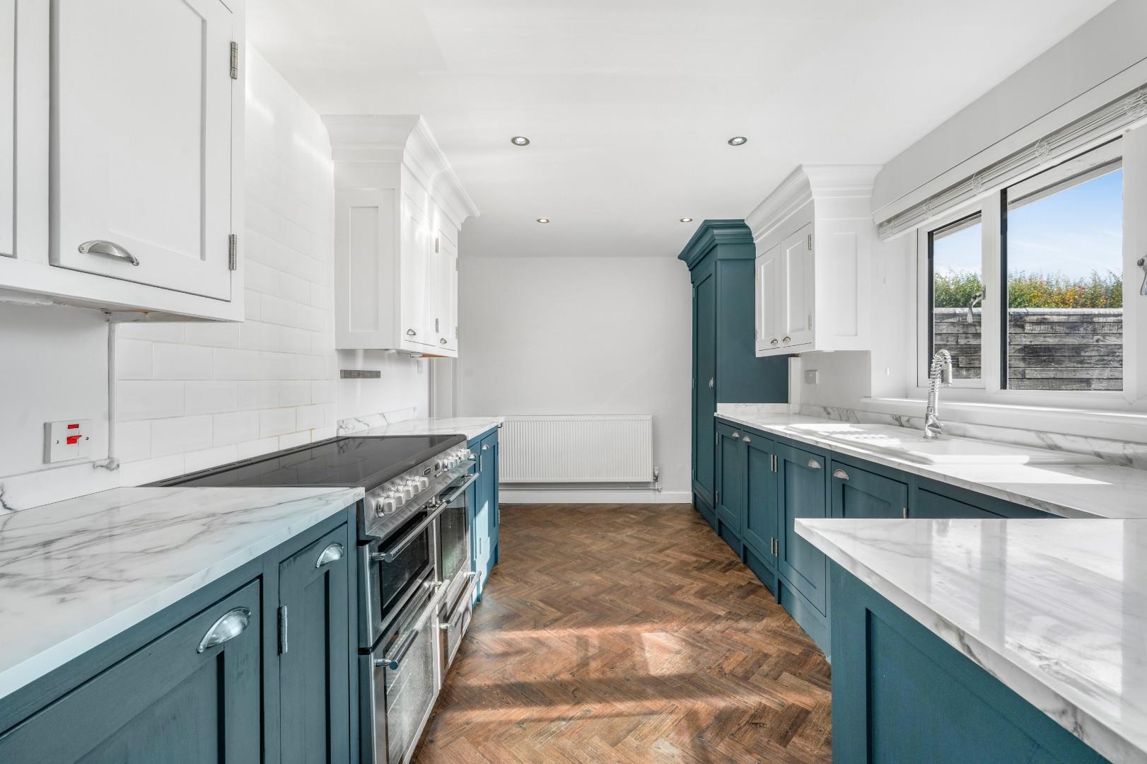 Kitchen - 4.60m x 3.07m (15'1" x 10'1") - UPVC double glazed window to rear aspect, base and eye level units with marble effect working surfaces over & splashbacks, under unit lighting, inset 1 1/2 bowl sink with drainer unit & mixer tap, space for range cooker & tiled splashback, integrated dishwasher, inset spotlights, herringbone style Oak flooring, radiator, power points, doorway to.