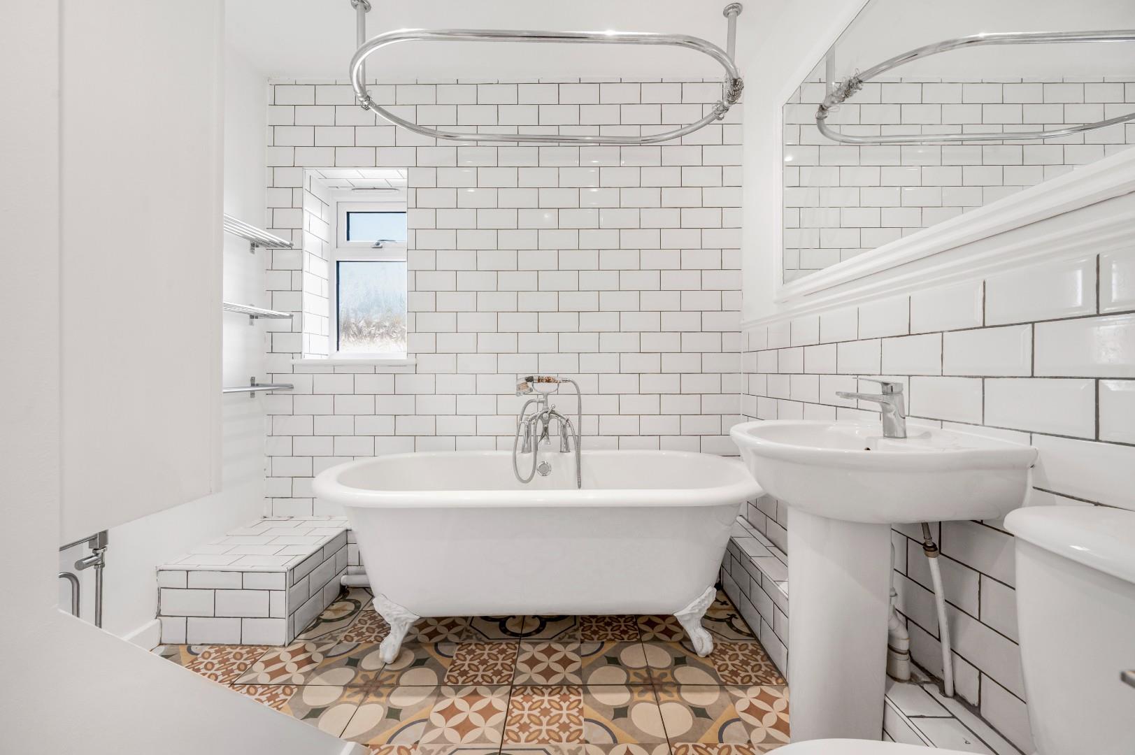 Family Bathroom - UPVC double glazed Opaque window to front aspect, freestanding claw foot bath with Victorian style mixer taps & shower attachment, wash hand basin with pedestal, W.C, heated towel rail, part tiled walls, tiled flooring, inset spotlights, extractor fan.