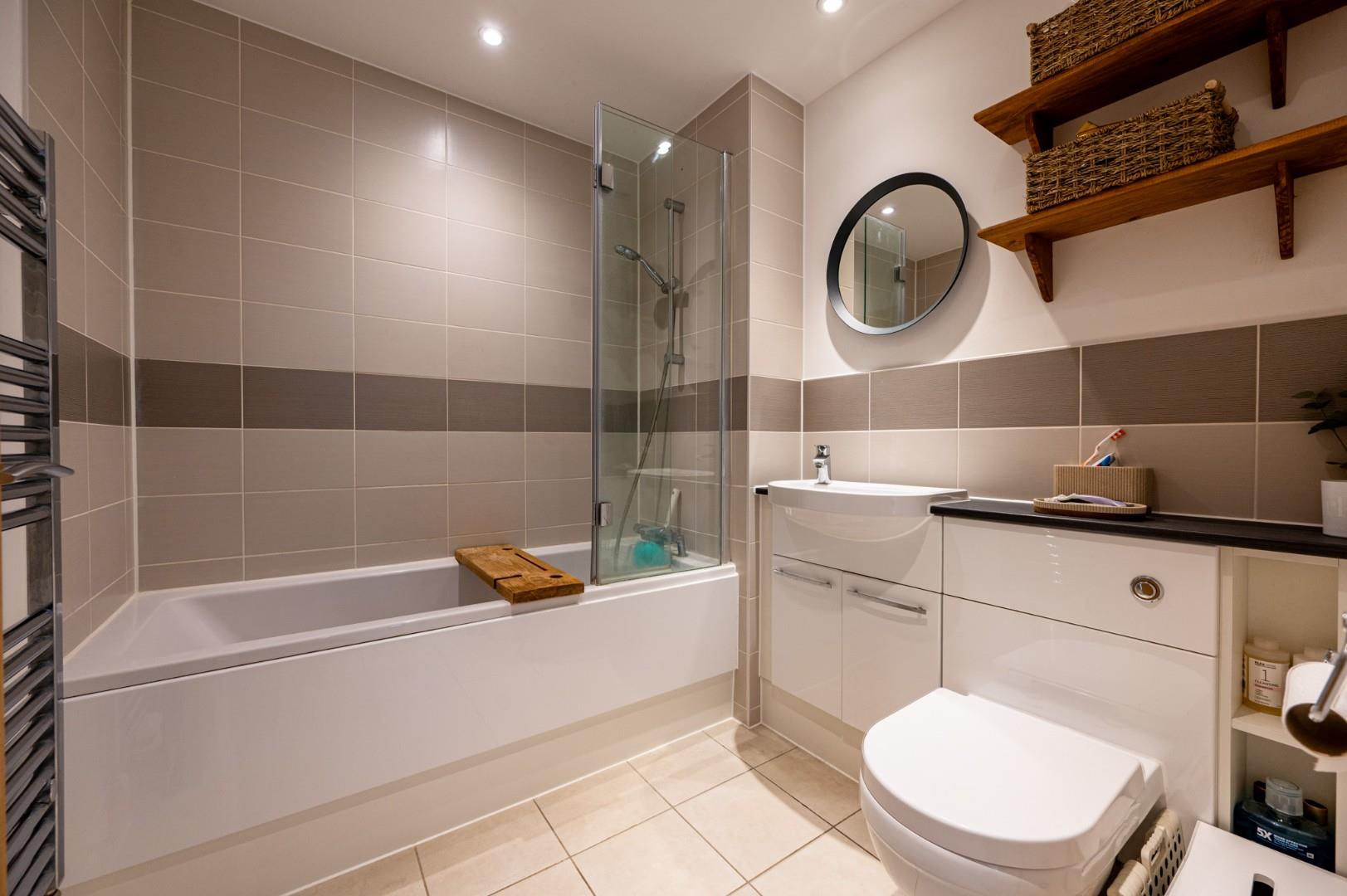 Family Bathroom - 2.133 x 1.992 (6'11" x 6'6") - Fitted with a panel enclosed bath with wall mounted shower attachment and glass scree, wash hand basin and W.C within vanity unit, wall mounted heated towel rail.