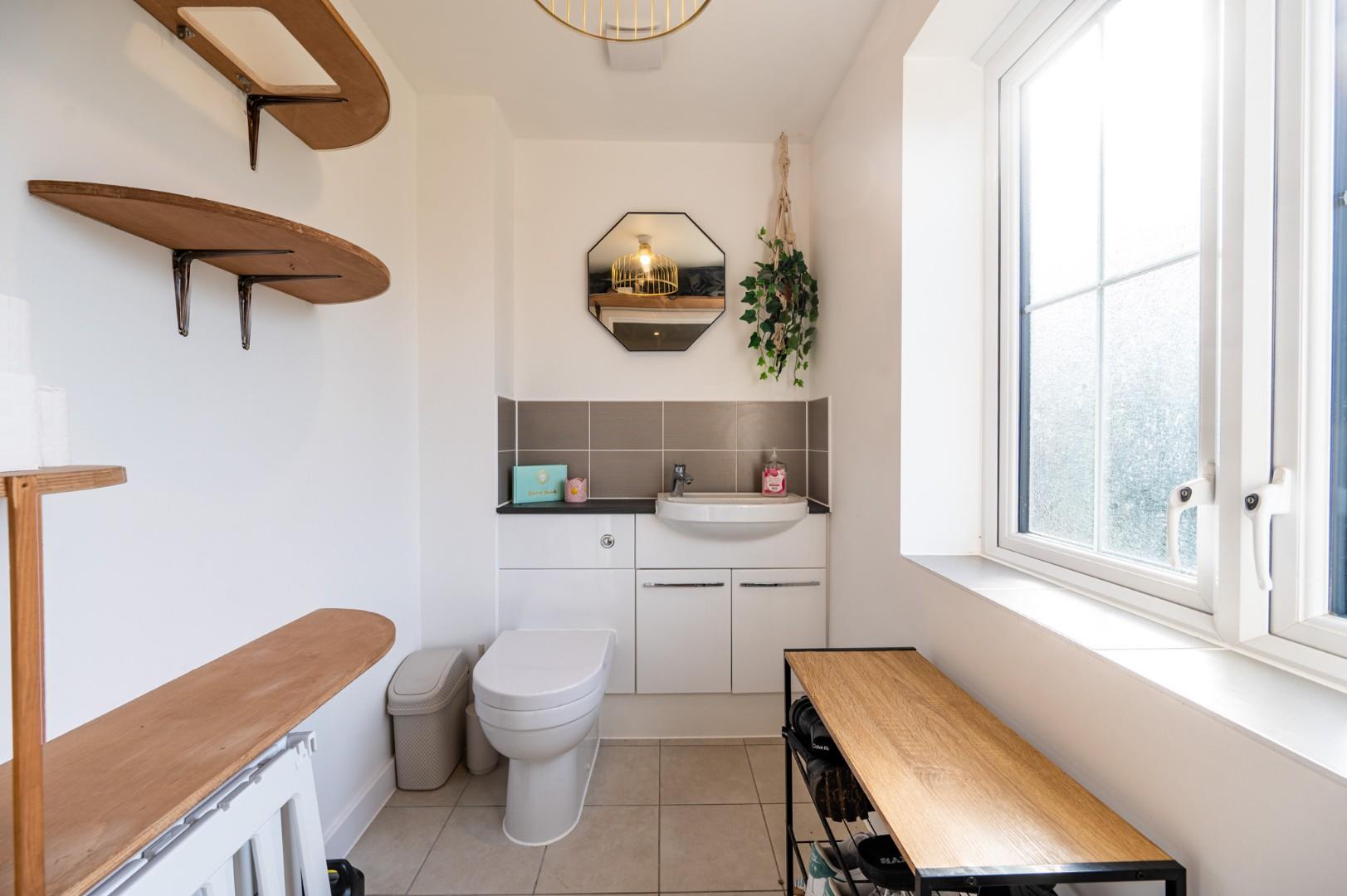 Cloakroom - Opaque window to front aspect, fitted with a wash hand basin and W.C within vanity unit.
