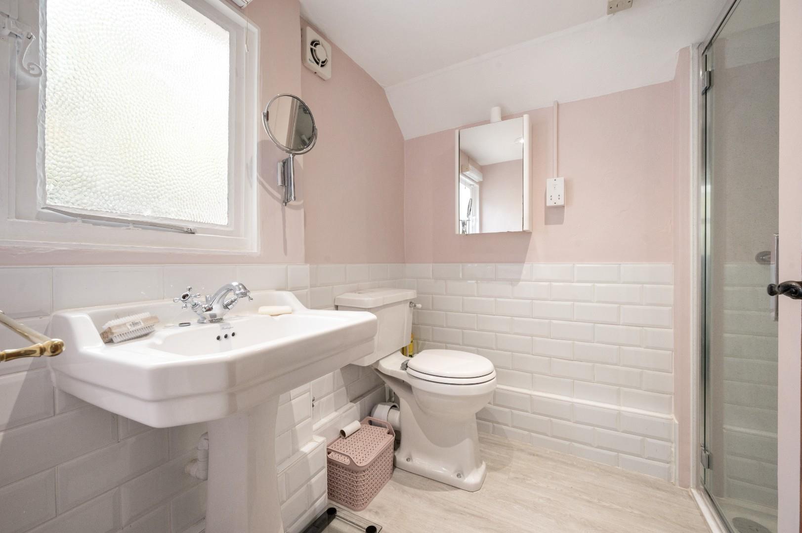 Shower Room - 2.30 x 1.93 (7'6" x 6'3") - Opaque window to rear aspect, fitted with a tiled shower cubicle with glass enclosure, low level W.C, wash hand basin with pedestal, extractor fan.