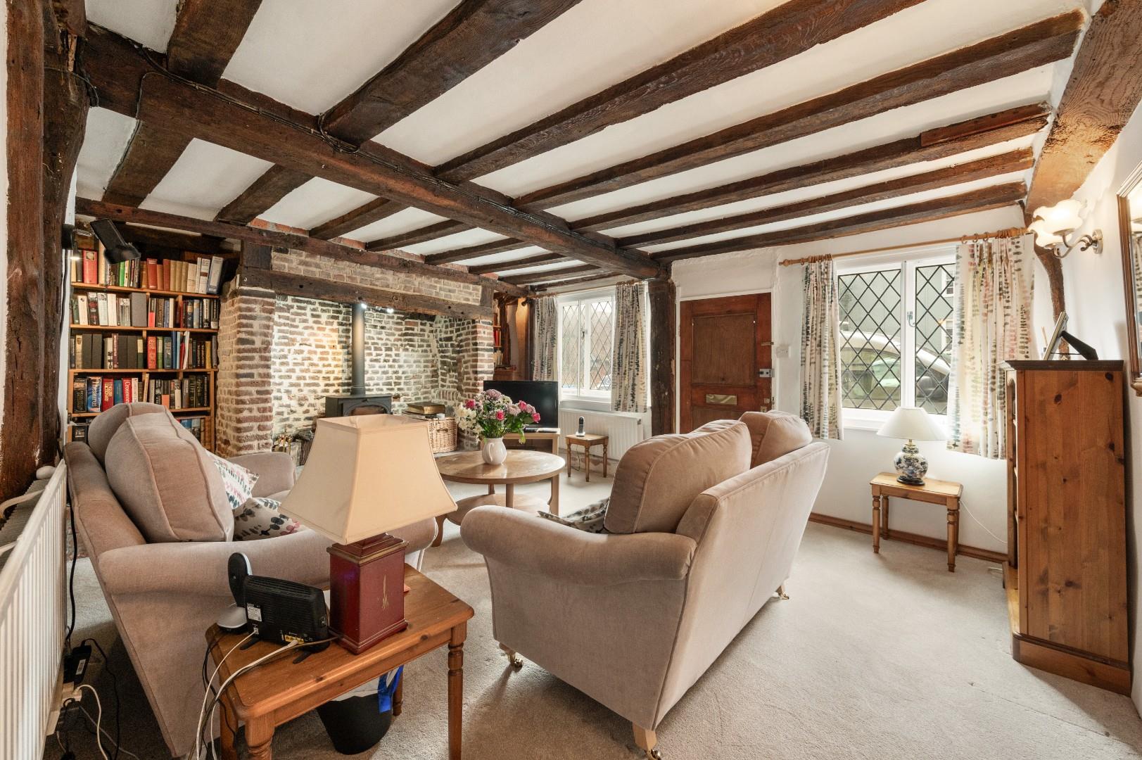 Living Room - 5.56 x 3.90 (18'2" x 12'9") - Accessed via front door, two windows to front aspect, inglenook fireplace with wood burning stove, exposed timbers, stairs rising to first floor, door leading to:-