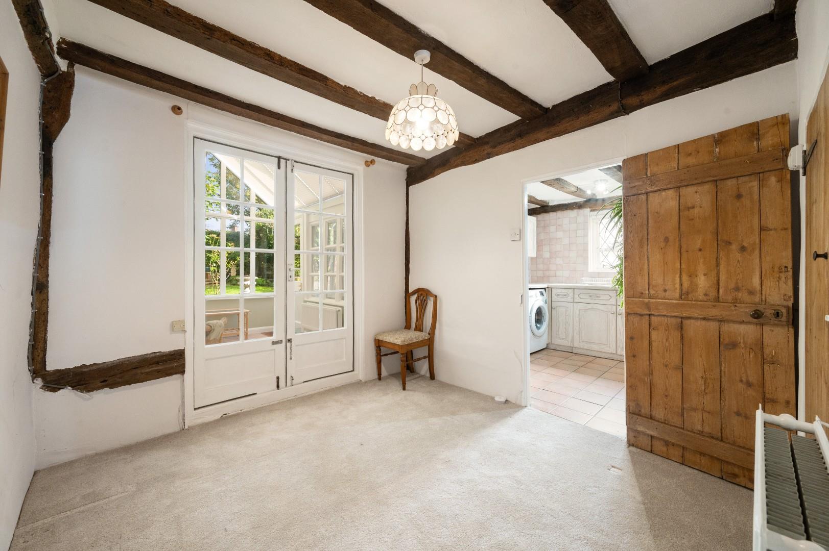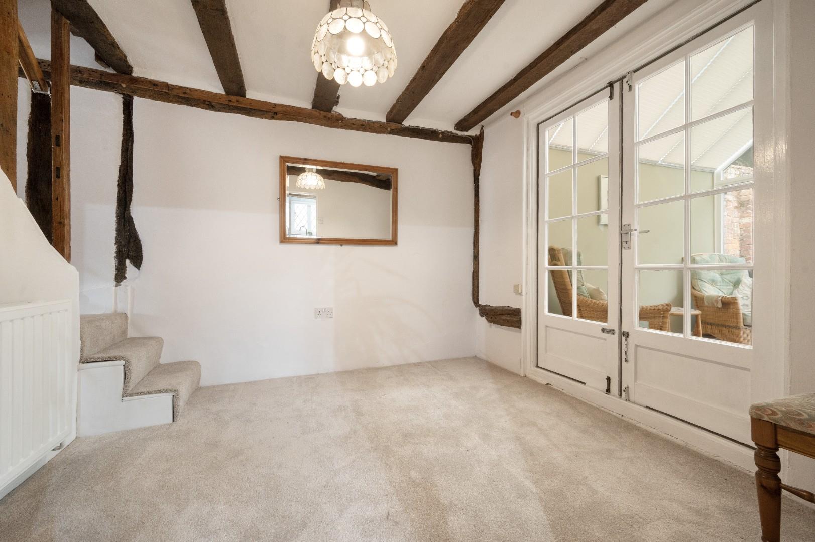 Dining Room - 2.83 x 2.73 (9'3" x 8'11") - Double doors leading to garden room, door to under stairs storage, stairs rising to first floor, exposed timber.