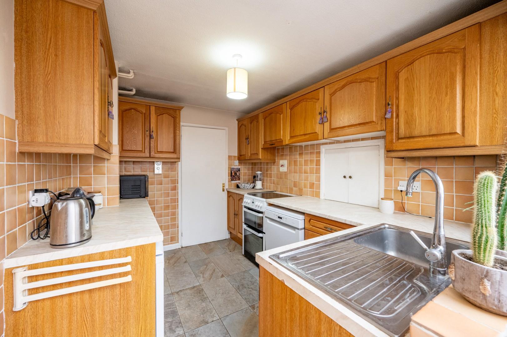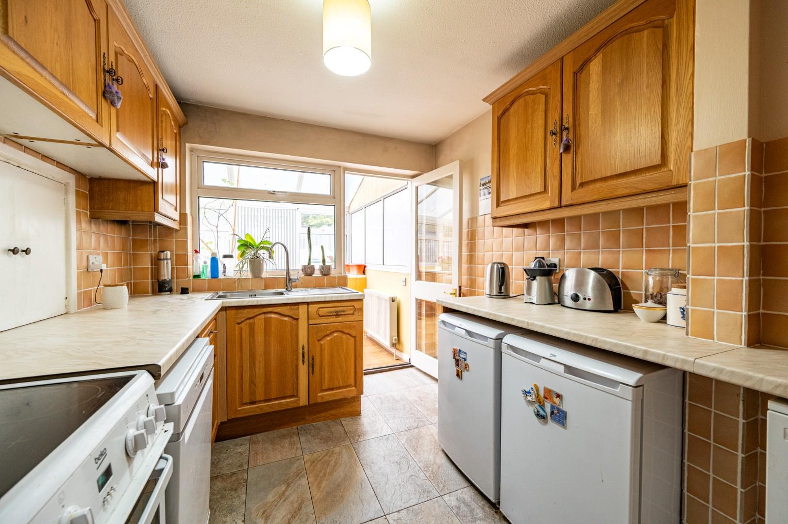 Kitchen - 3.260 x 2.474 (10'8" x 8'1") - Fitted with a range of eye and base level units with working surface over, free standing cooker, space for fridge, space for freezer, space for dishwasher, inset sink and drainer unit with mixer tap, window to rear aspect, fully glazed door leading to conservatory.