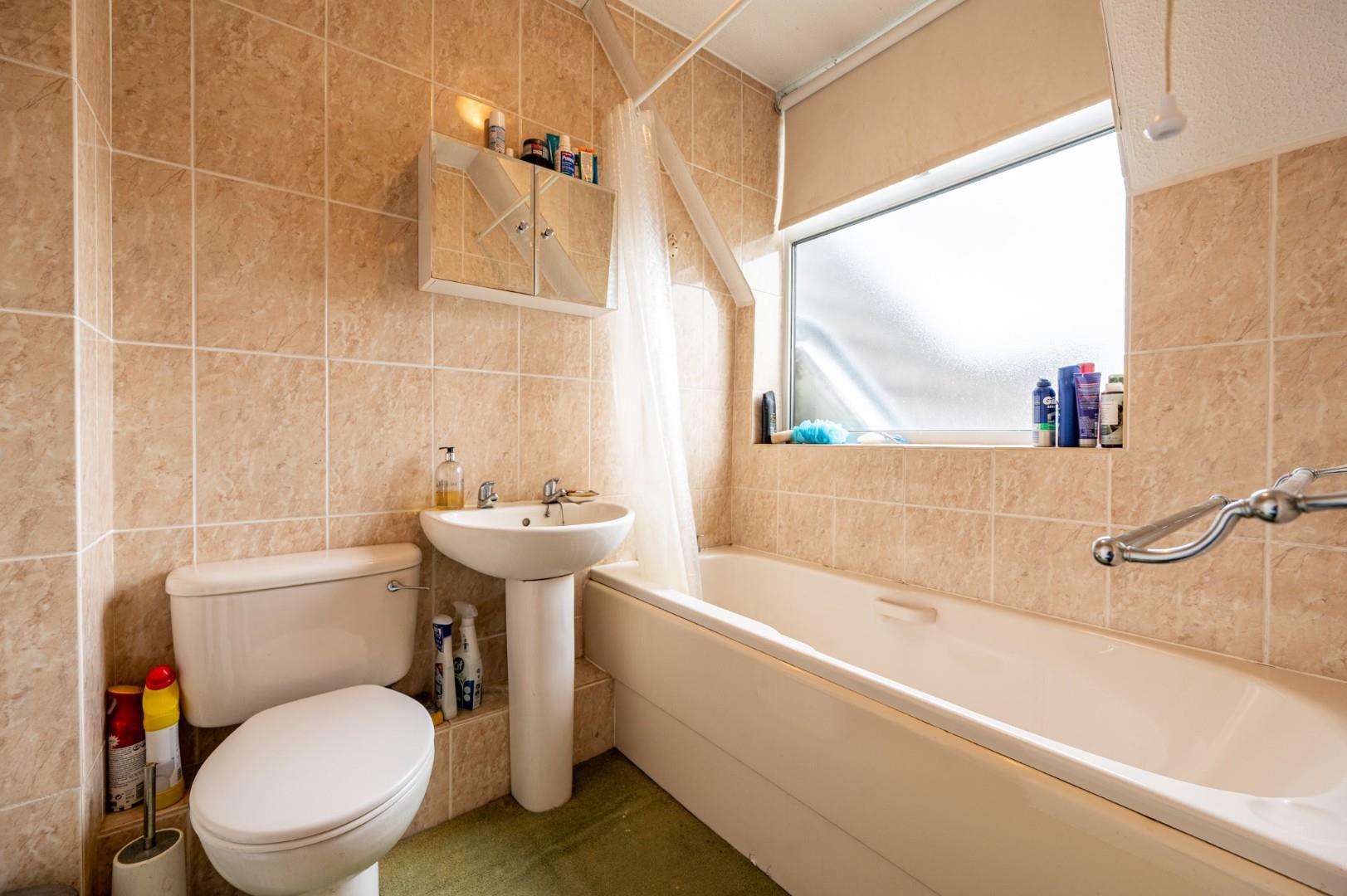 Family Bathroom - 1.655 x 2.024 (5'5" x 6'7") - Opaque window to front aspect, fitted with a panel enclosed bath, low level W.C, wash hand basin with pedestal.