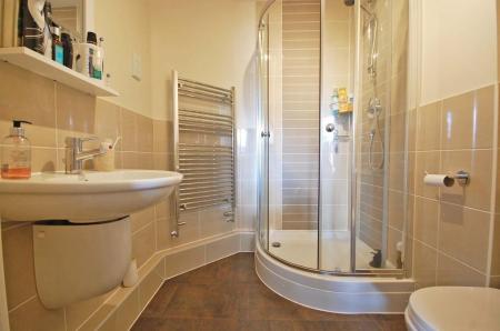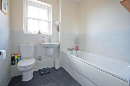 Double glazed opaque window to rear aspect, partly tiled walls, panelled bath with central mixer taps with shower attachment, low level WC, vanity wash hand basin, heated towel rail, vinyl flooring, smooth ceiling.