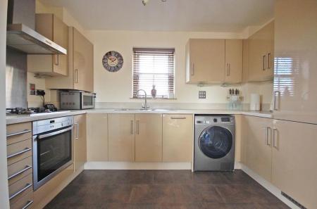 Double glazed window to rear aspect, matching wall and base units with roll top work surfaces, one and a half bowl sink and drainer with central mixer taps, built-in oven, gas hob, extractor hood, integrated fridge/freezer and dishwasher, space for washing machine, wall mounted boiler, vinyl flooring, smooth ceiling.