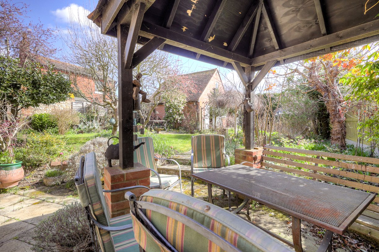 The rear garden is walled along its northern boundary and features mature trees and shrubs. A patio area with a covered pergola provides a peaceful, shaded spot for relaxing or entertaining.