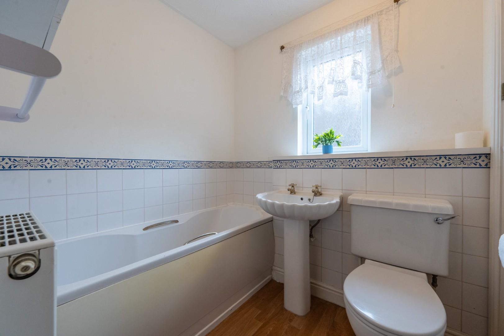 Family Bathroom - Opaque window to side aspect, panel enclosed bath, wash hand basin with pedestal, low level W.C