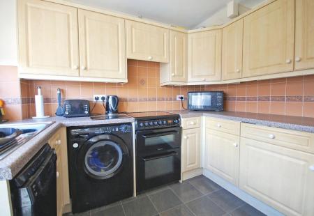 Double glazed window to rear aspect, matching wall and base units with roll top work surfaces, sinle bowl sink and drainer with central mixer taps, integrated fridge and freezer, space for dishwasher, washing machine and cooker, radiator, tiled flooring, smooth ceiling.