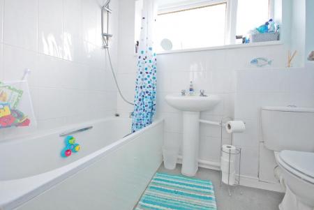 Double glazed opaque window to rear aspect, fully tiled, panelled bath with shower attachment, low level WC, heated towel rail, vinyl flooring, smooth ceiling.