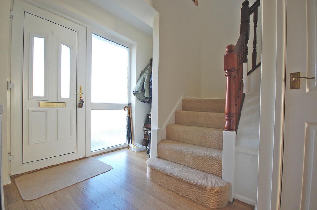 Opaque double glazed window to front aspect, stairs to first floor, understairs storage cupboard, radiator, laminate flooring and textured ceiling.