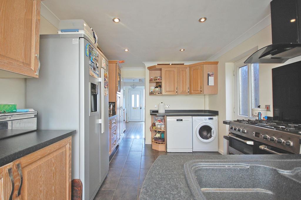 A series of matching base and wall units, one and a half bowl sink with central mixer tap and drainer, double cooker with five ring gas hob and extractor hood over, space for fridge/freezer, dishwasher and washing machine, tiled flooring and smooth coved ceiling with sunken spotlights. Part glazed door to side. Open to conservatory.