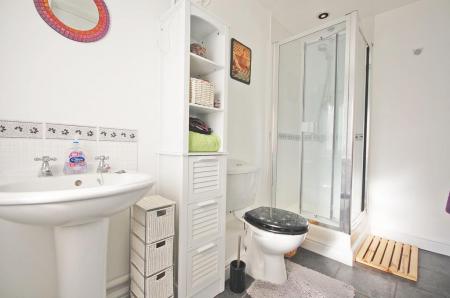 Opaque double glazed window to rear aspect, fully tiled single shower, low level WC, pedestal wash hand basin, shaver point, extractor fan, radiator, tiled flooring and smooth ceiling with sunken spotlights.