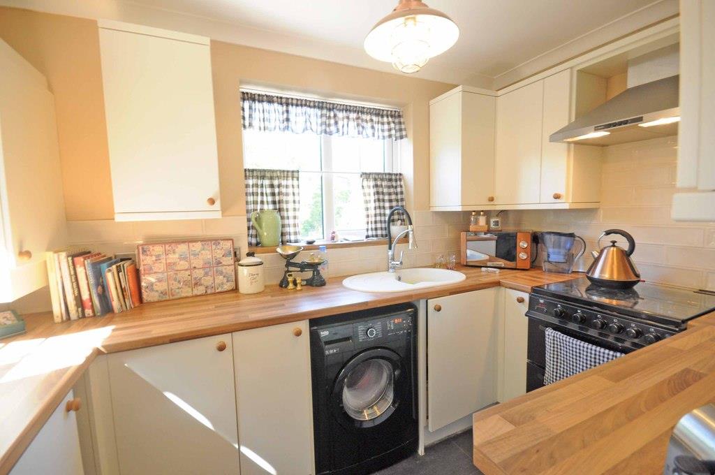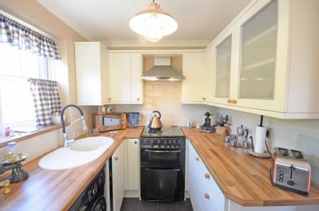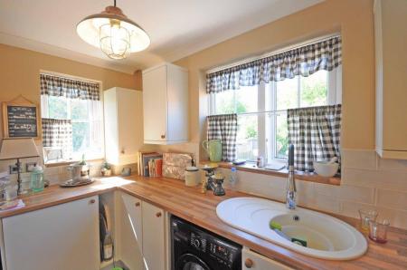 Double glazed window to side and rear, range of matching base and wall units with wood effect work surfaces, single sink with drainer unit and central mixer taps and tiled splashbacks, built-in cooker, integrated tumble dryer, space for fridge/freezer and washing machine, wall mounted boiler in cupboard, vinyl flooring and smooth coved ceiling.