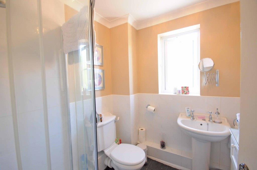 Opaque double glazed window to side, single shower, low level WC, pedestal wash hand basin with tiled splashbacks, shaver point, heated towel rail, vinyl flooring and smooth ceiling.