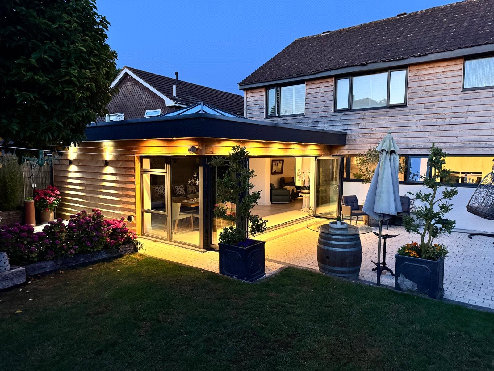 Paved terrace across the rear of the property. Seating area with railway sleepers planted up leads to a lawn area with shrubs and planted borders. Sensored lighting all round the garden.
