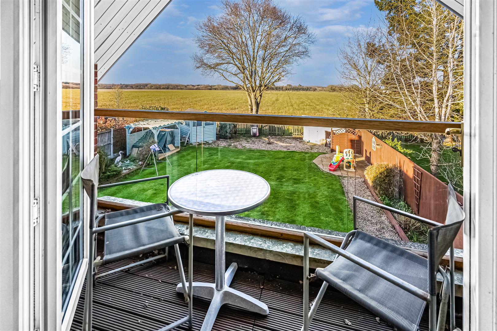 To the first floor, the principal bedroom enjoys a lovely outlook over the rear garden and adjoining farmland, with the added benefit of a balcony and an en-suite shower room. There are two further double bedrooms, a single bedroom and a family bathroom serving the remaining accommodation.