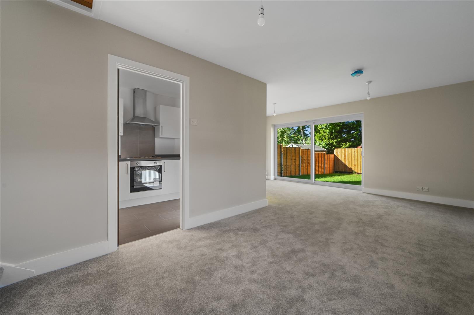 The entrance hall leads into a generous sitting room, a bright and versatile space that comfortably accommodates both relaxation and dining. The kitchen is smartly fitted with a modern range of units, an integrated oven and hob, and space for additional appliances, providing a practical and stylish setting for home cooking.