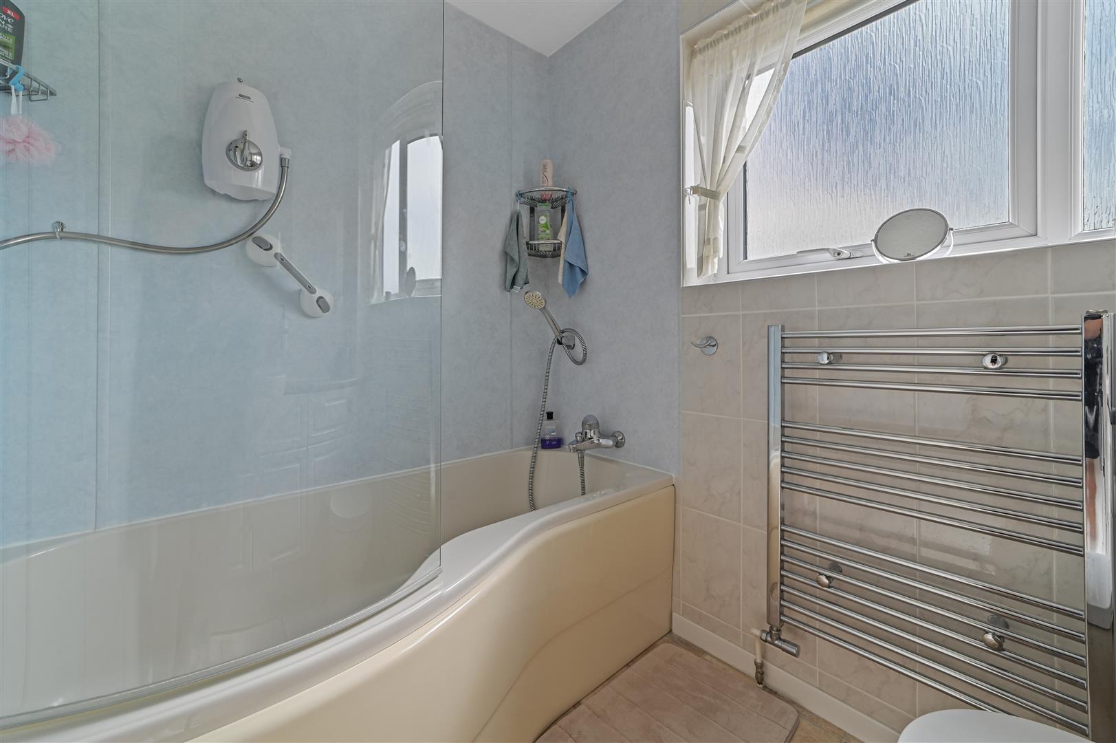 Upstairs, the first-floor landing connects two double bedrooms with fitted wardrobes, two additional bedrooms, and a family bathroom equipped with a P-shaped bath and an electric shower overhead, making for a convenient and comfortable living space.
