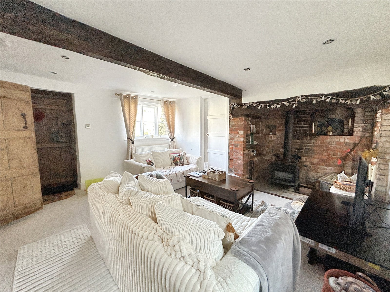 The sitting room is a welcoming space, centred around a stunning inglenook fireplace with log burner, that adds warmth and period appeal. The kitchen is well-proportioned and blends character features with practical modern living. Upstairs, the property offers two comfortable double bedrooms and a bathroom.