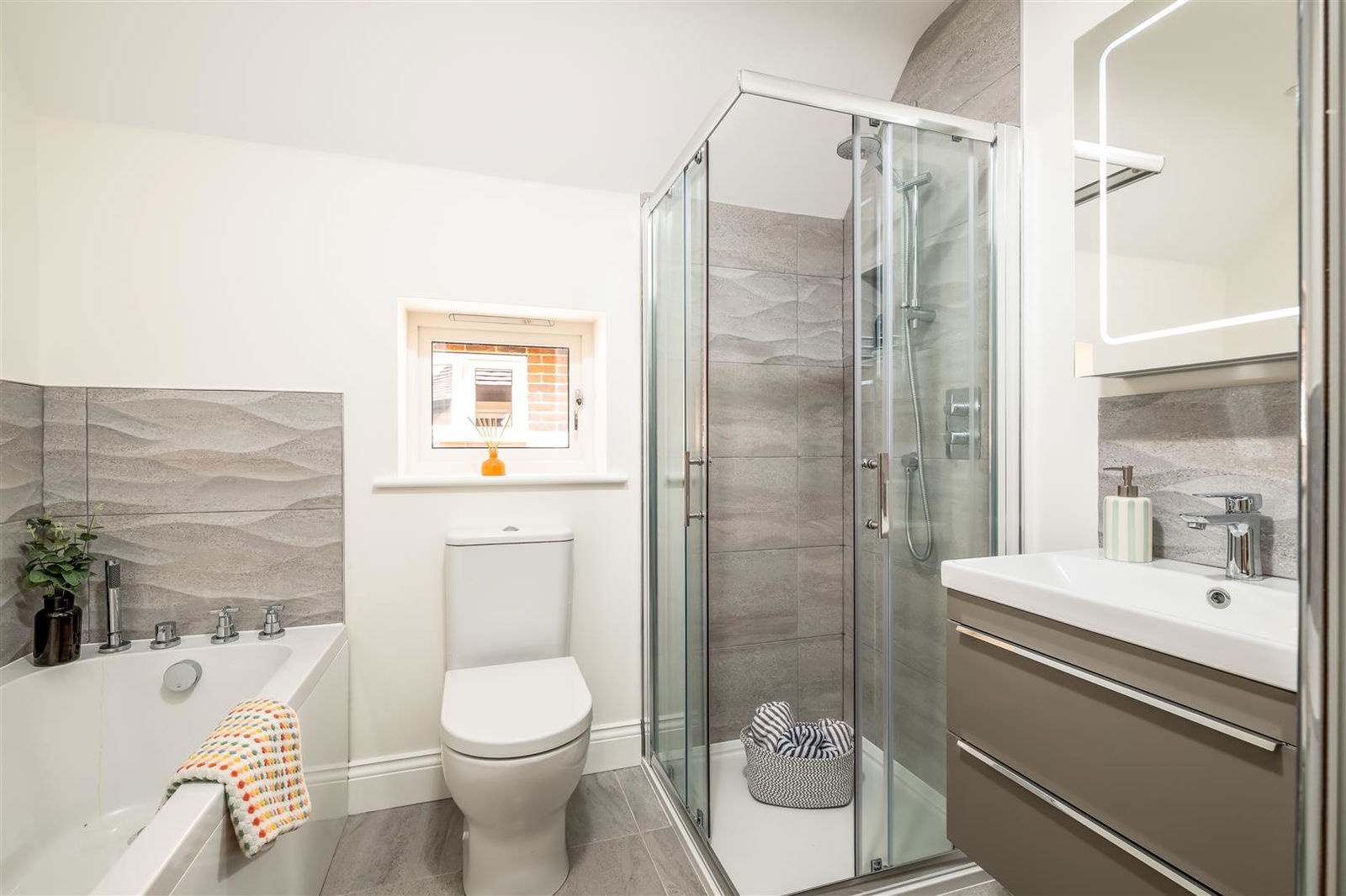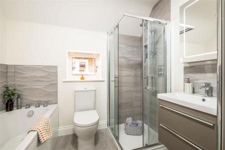 • Contemporary styled bathrooms • Vanity basin with chrome tap • Mirror with light and de-mist element • Showers with adjustable heads • Baths with chrome filler taps, shower screen and shower over • WCs with water efficient dual flush and soft close seats • Heated towel rails • Ceramic floor tiles and wall tiling to selected areas