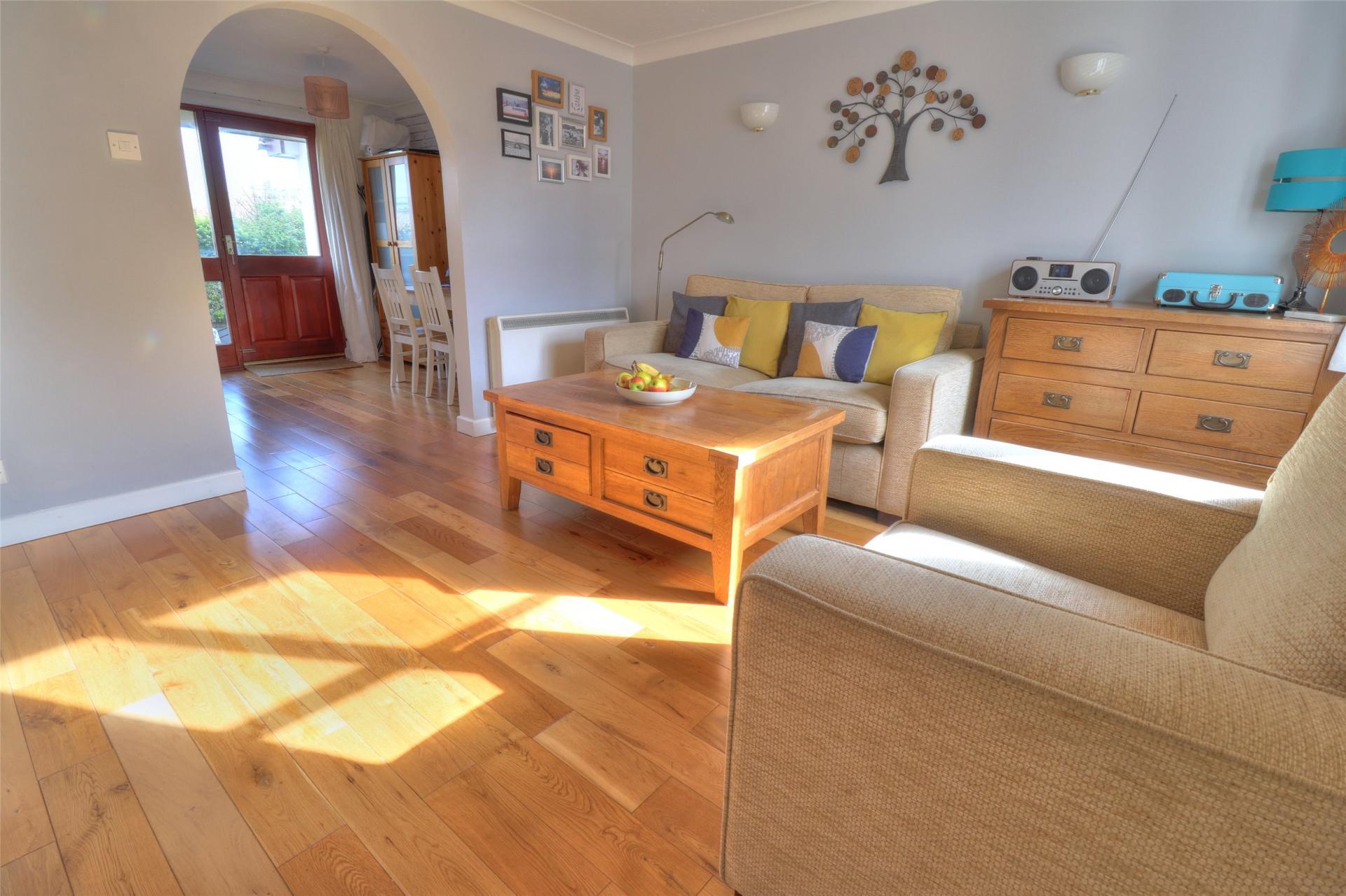 The accommodation includes an entrance porch with built-in storage, ideal for beach equipment, a light and spacious living room, and a kitchen/diner overlooking the fields to the rear with a range of wall and base units and access to the rear garden.