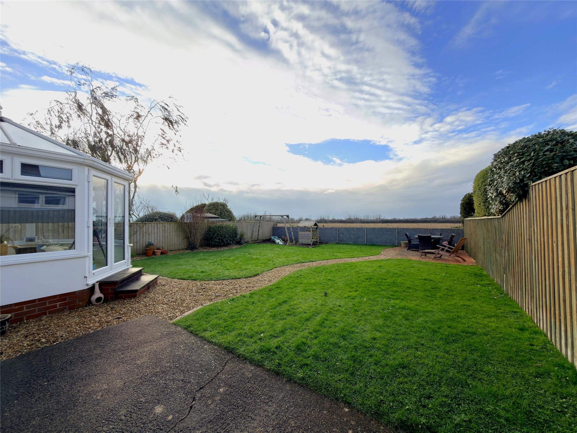 The front of the property has a gated driveway for two cars tandem, front lawn, garage and side access to the rear. The rear garden has two areas for outdoor dining, play area and lawn with walled boundary overlooking the field.