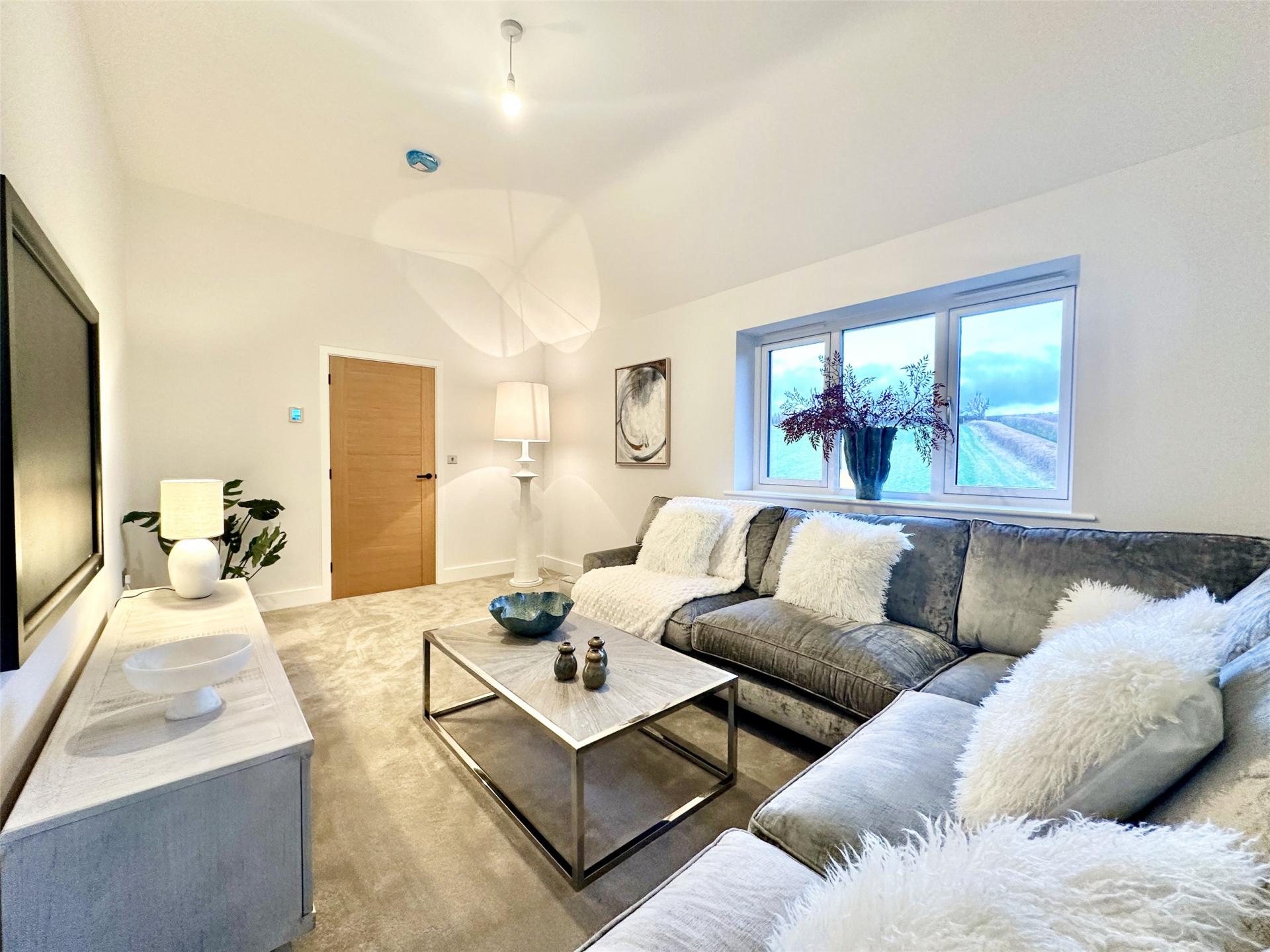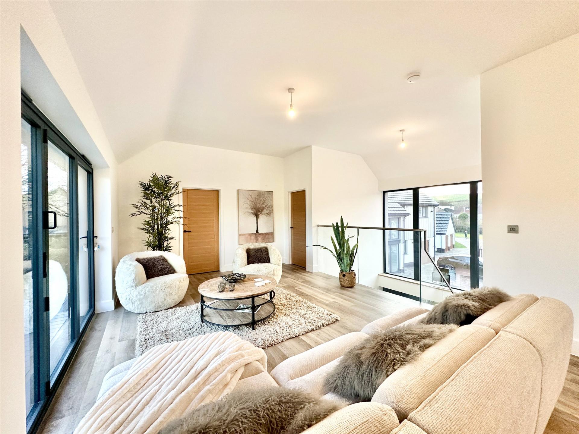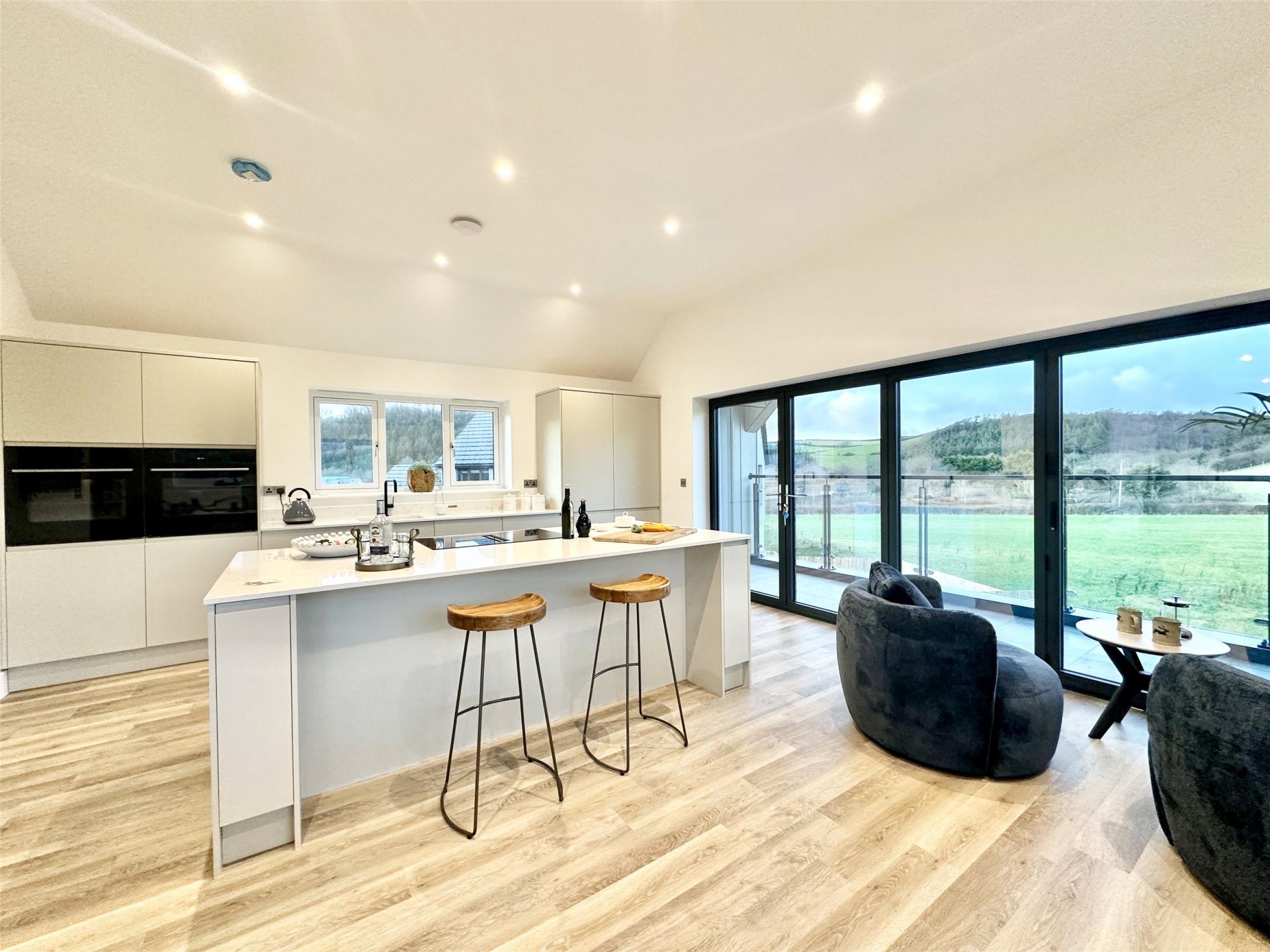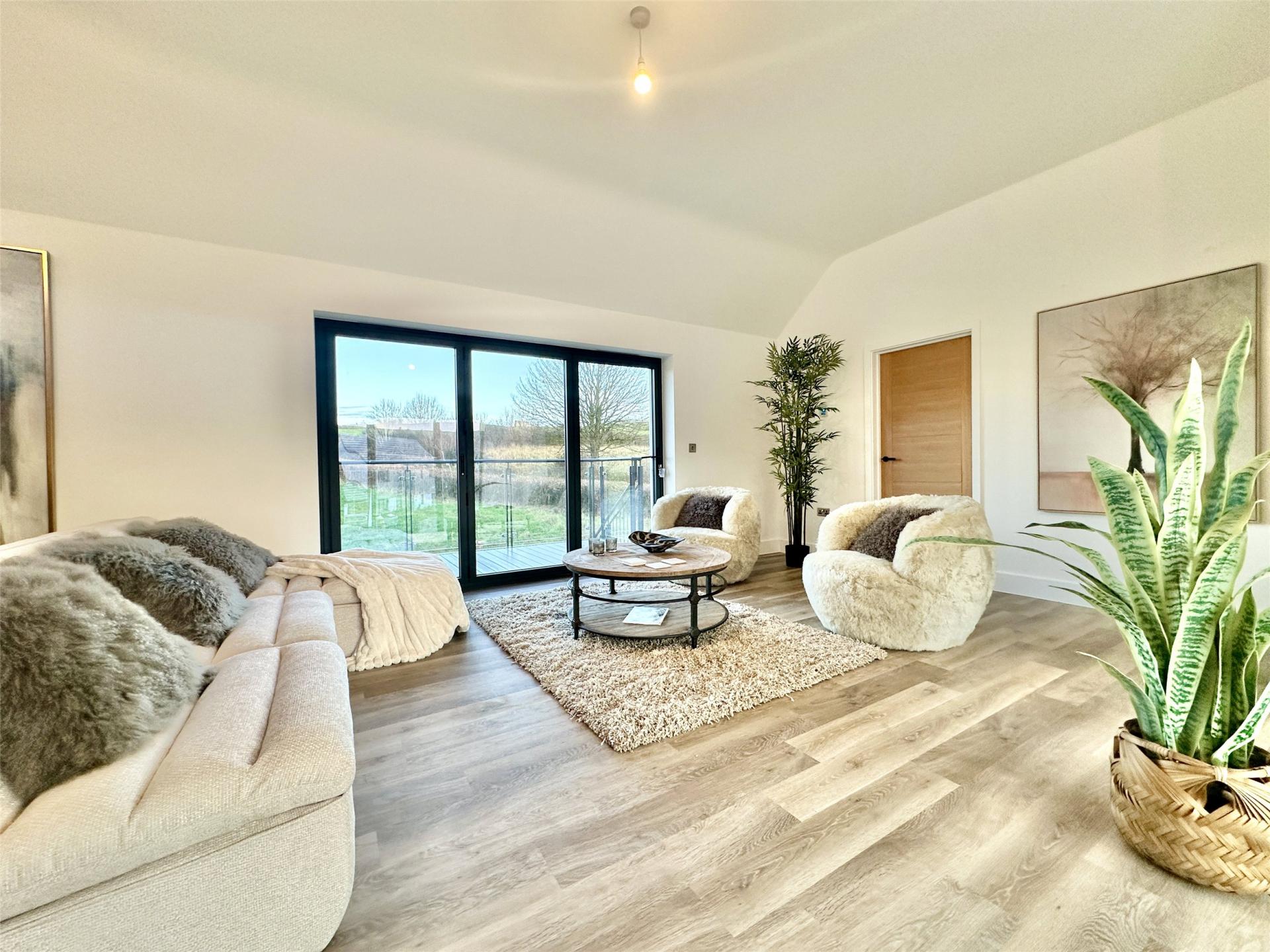 Bi-folding doors open from the kitchen end onto a covered balcony, perfectly positioned to enjoy the views in all seasons. A second balcony at the rear also enjoys beautiful outlooks and offers steps leading directly down to the garden, ensuring strong connectivity between the elevated living space and outdoor areas.