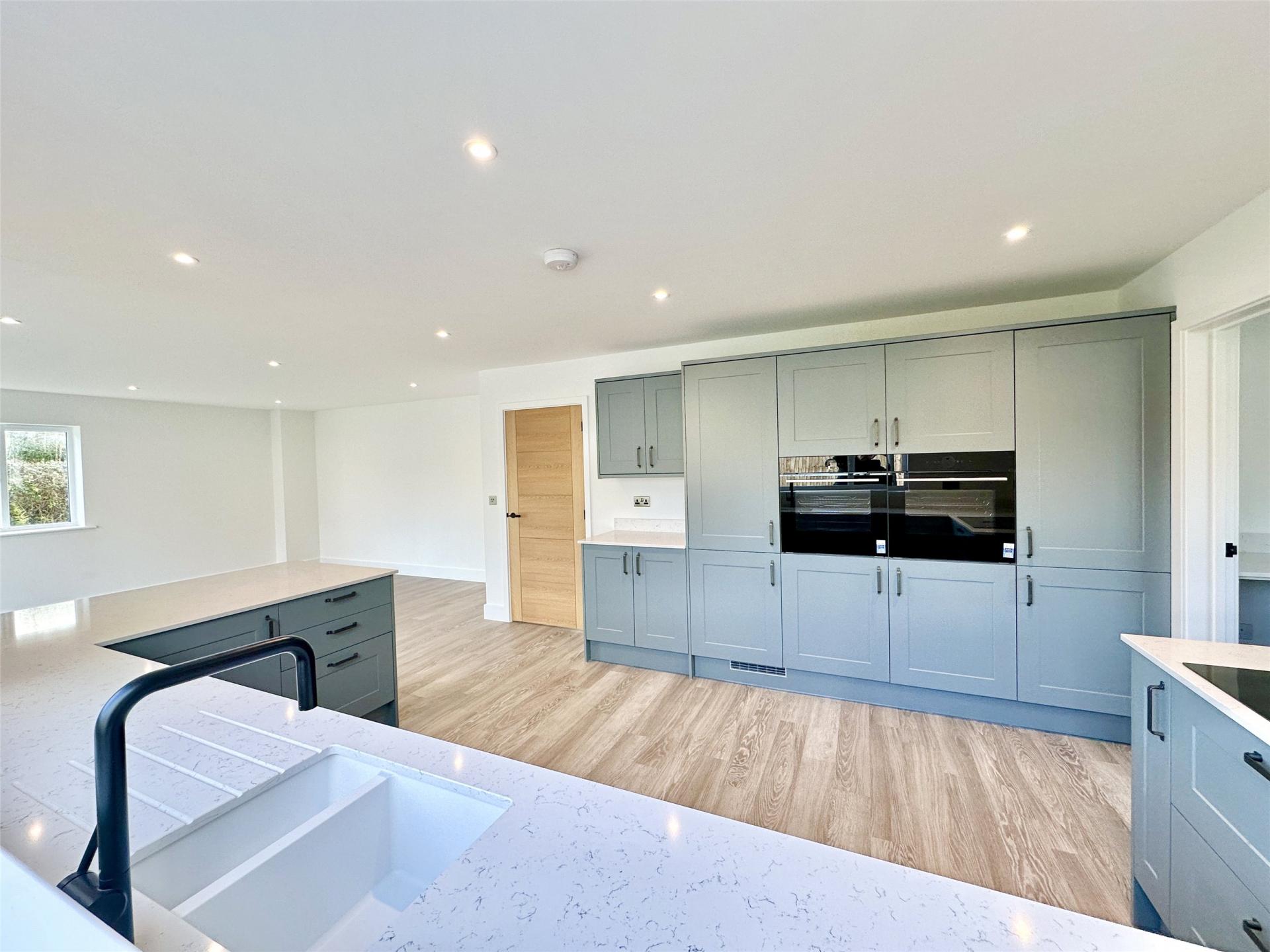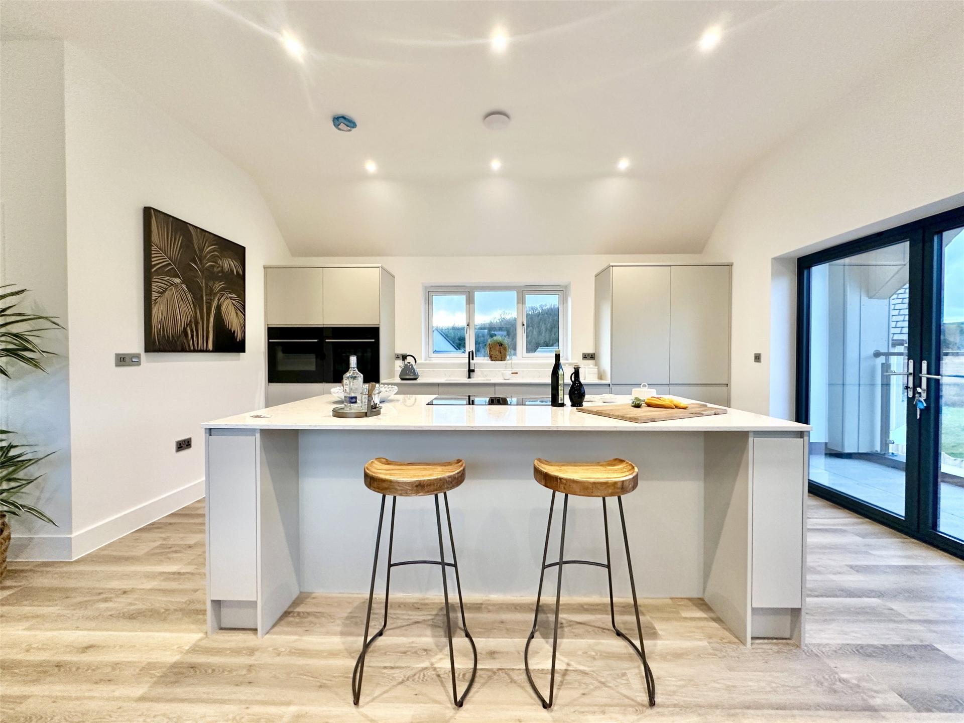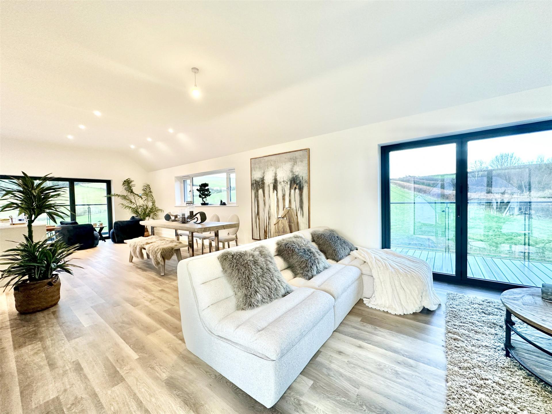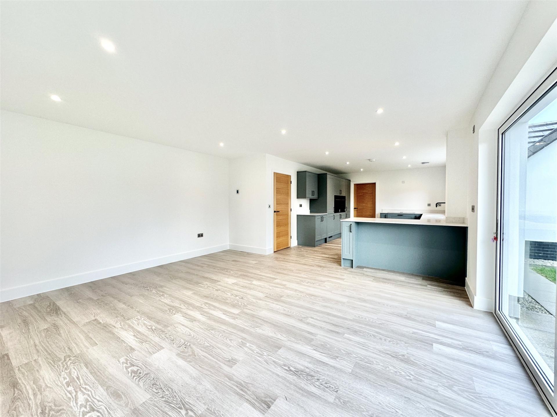 Bi-folding doors open from the kitchen end onto a covered balcony, perfectly positioned to enjoy the views in all seasons. A second balcony at the rear also enjoys beautiful outlooks and offers steps leading directly down to the garden, ensuring strong connectivity between the elevated living space and outdoor areas.