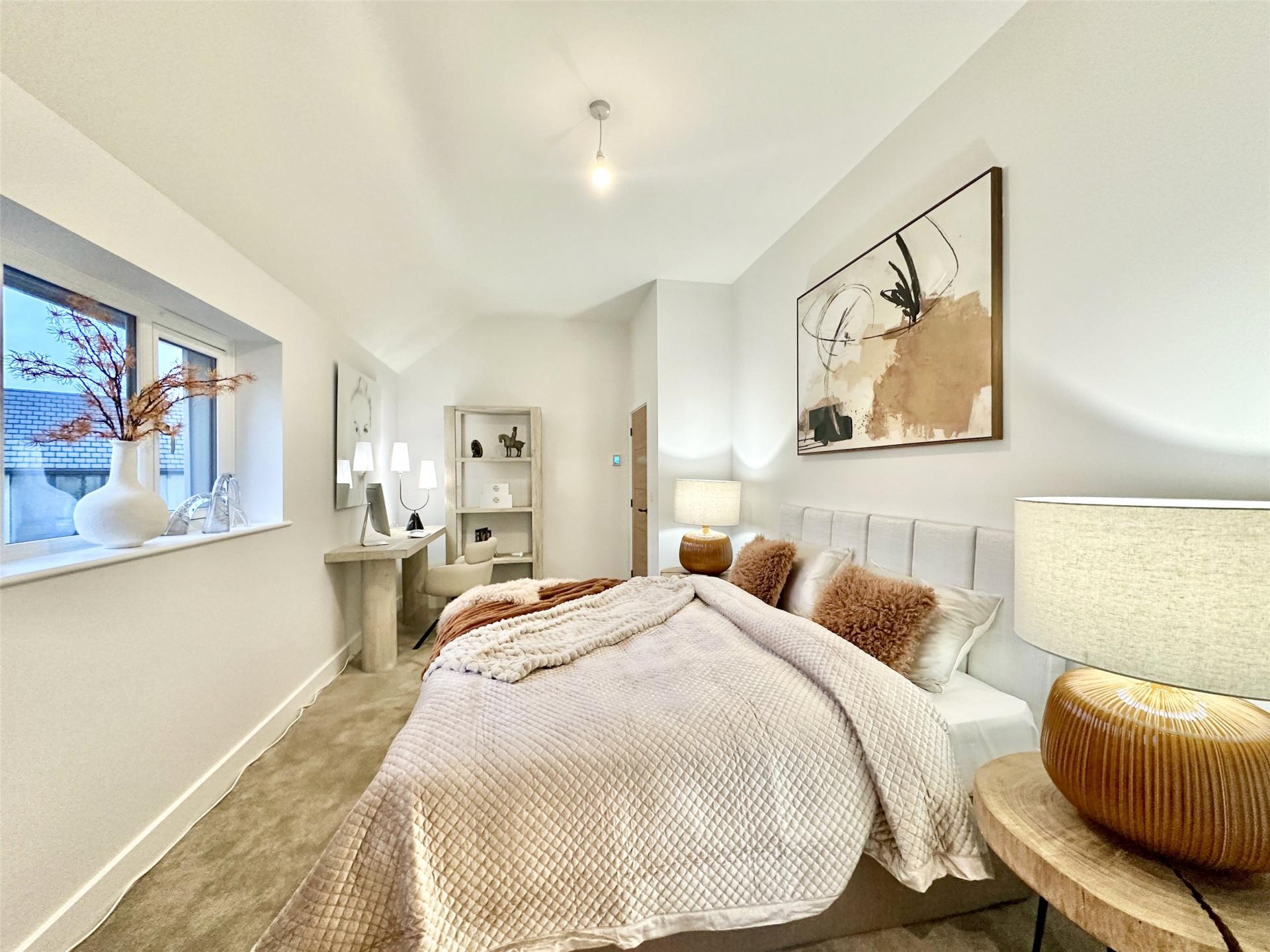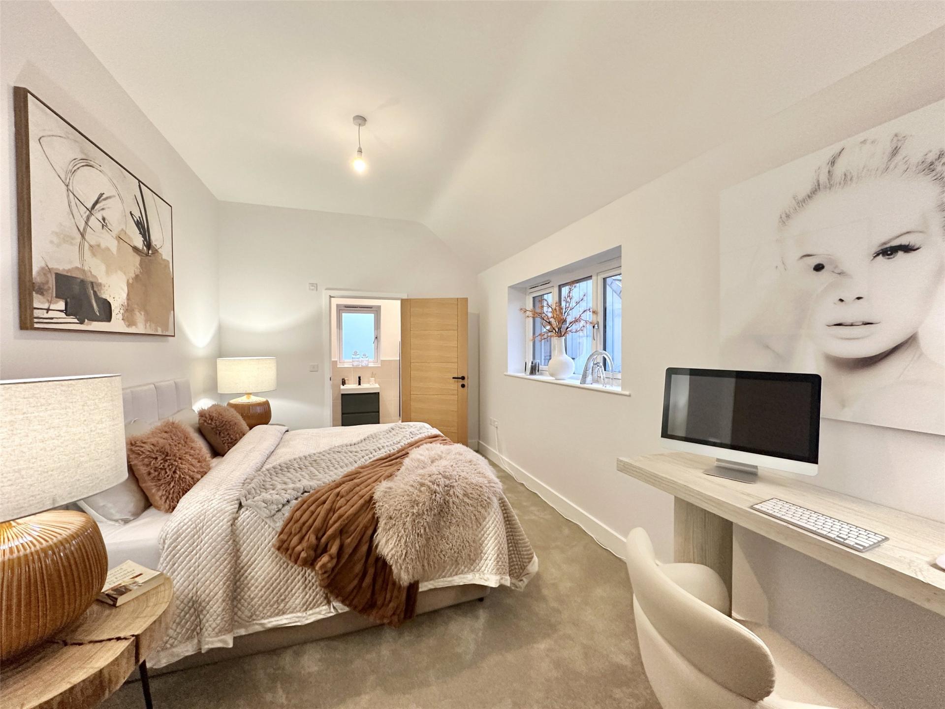 On the upper floor, the home is completed by a generous master bedroom suite, featuring a stylish modern en suite shower room and enjoying the same elevated feel and vaulted ceilings as the main living space.