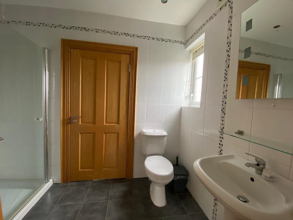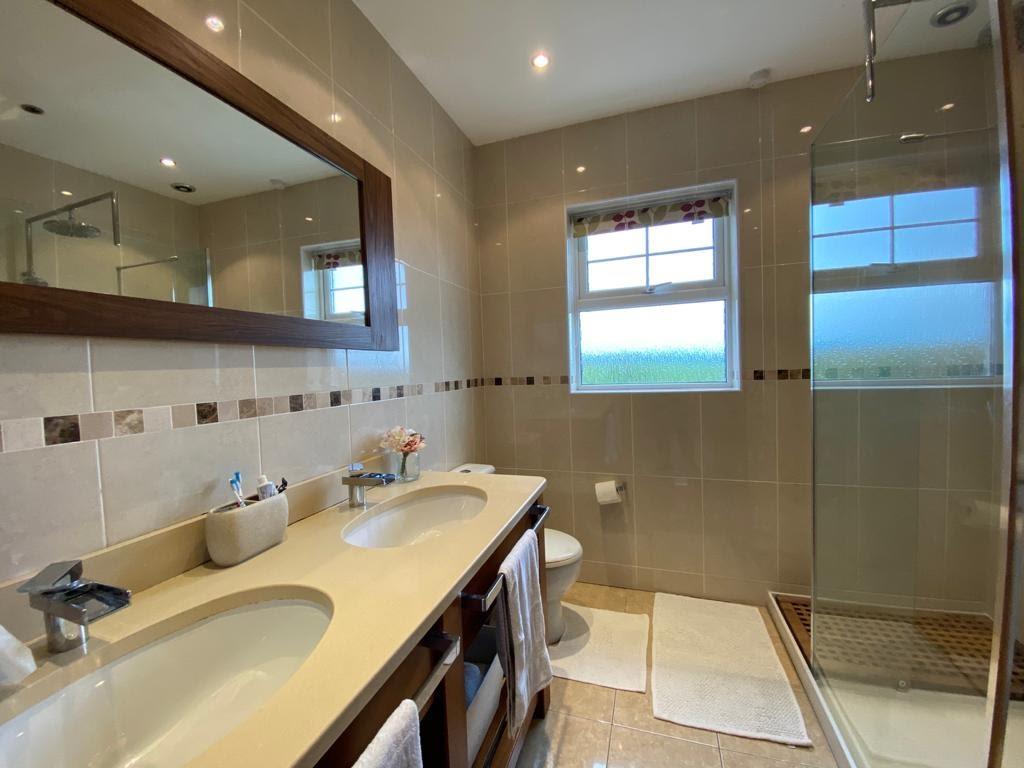 Comprising fully tiled walk in shower; his and her wash hand basins, WC; fully tiled walls and floor; recessed lighting
