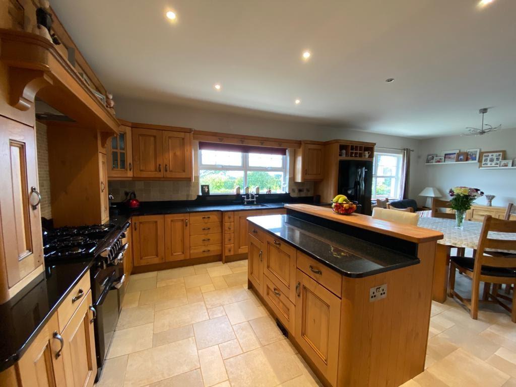 8.03m' x 4.32m' (26'4' x 14'2') - Having excellent range of eye and low level units, granite worktops and splash back, stainless steel sink unit; Rangemaster' cooking centre; matching overmantle with extractor hood; integrated dishwasher; matching pelmet over window; centre island unit with storage under and breakfast bar; wine rack, part wall tiling, tiled floor, ample dining space and family area with multi fuel stove set on raised hearth, tiled floor.