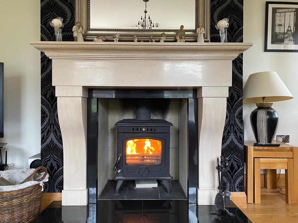 4.67m' x 4.04m' (15'4' x 13'3') - Having magnificent fireplace with multi fuel stove; semi solid wood floor; double doors to:-
