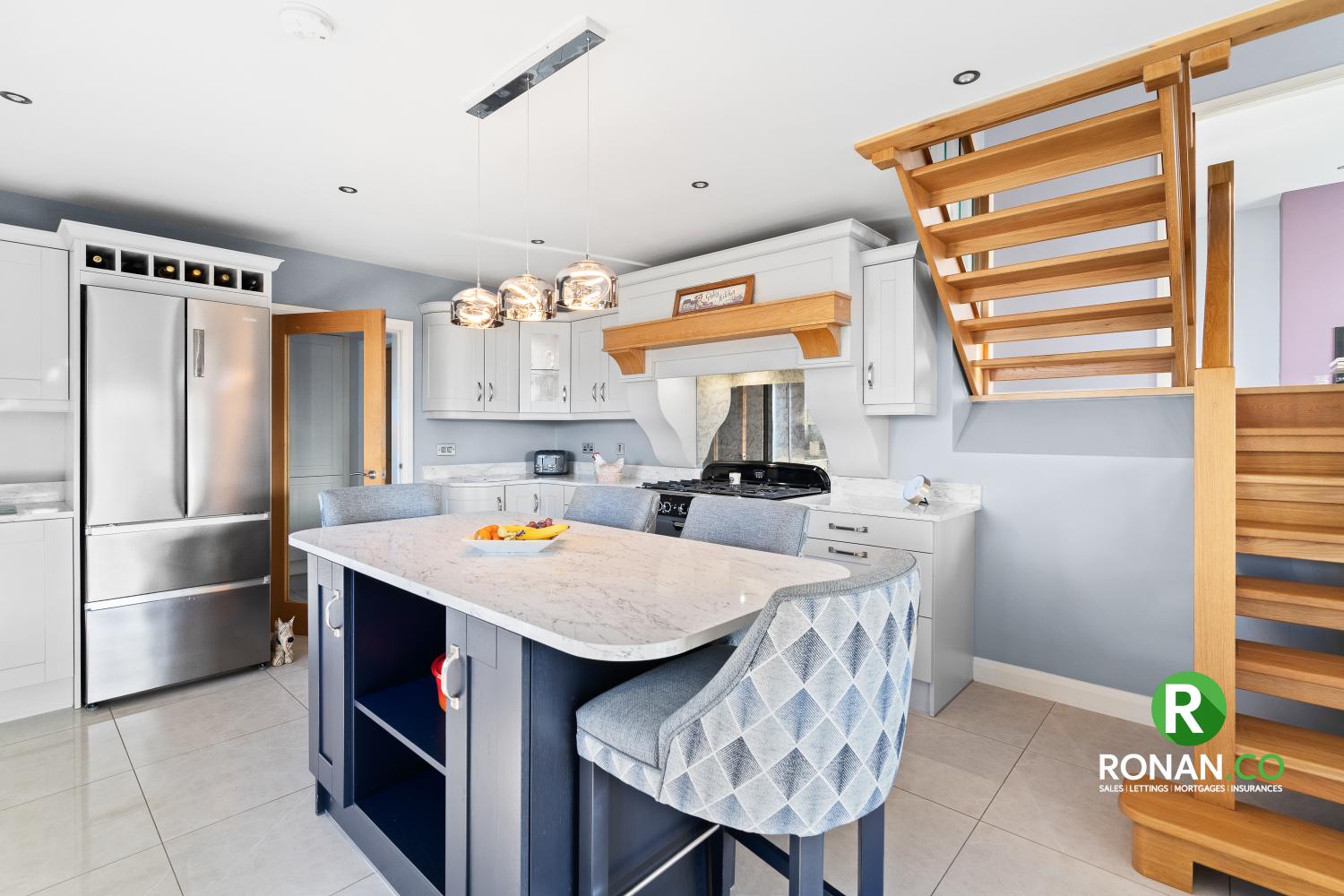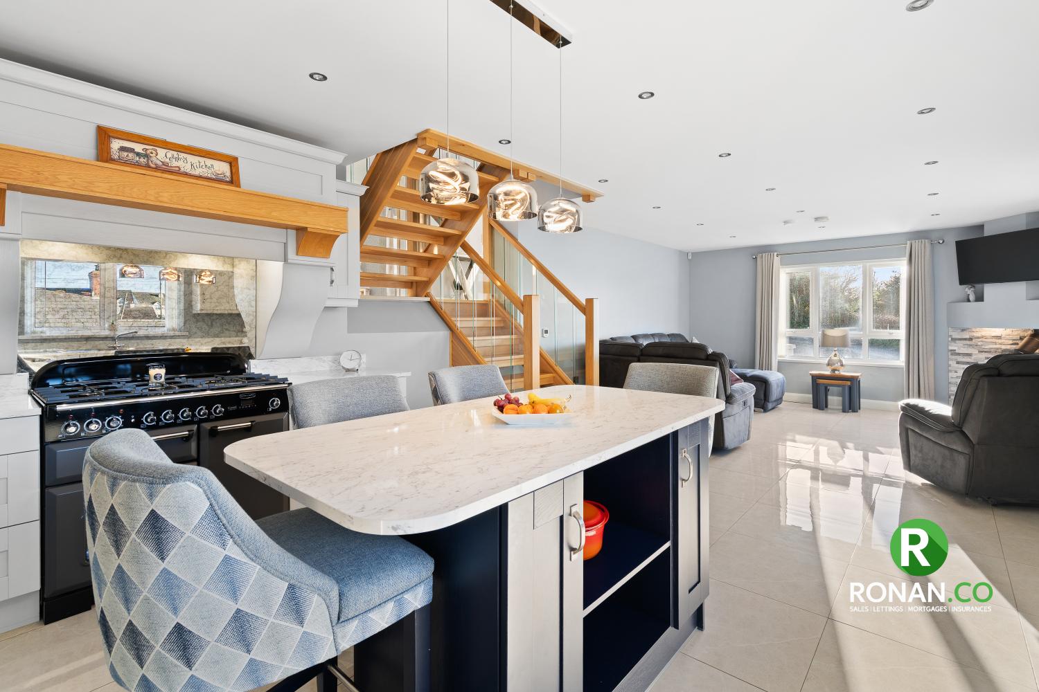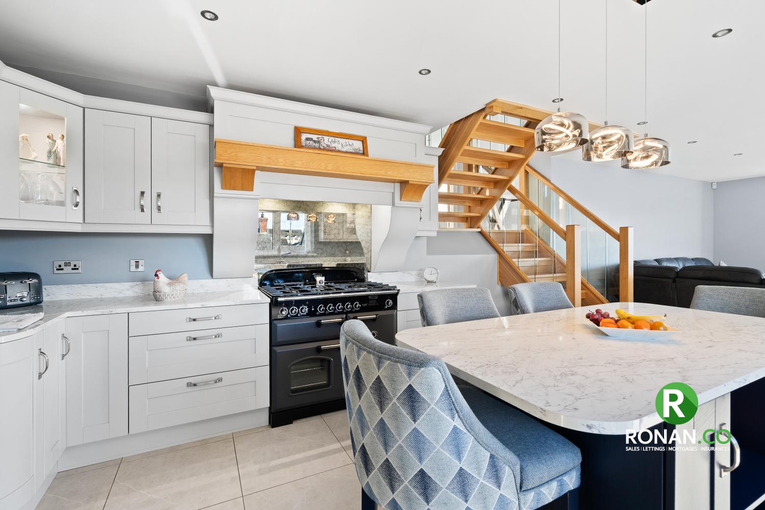 Tiled Flooring, Integrated Dishwasher, Rangemaster Classic Dual Fuel, LED Wine Cooler, Henley Stove
