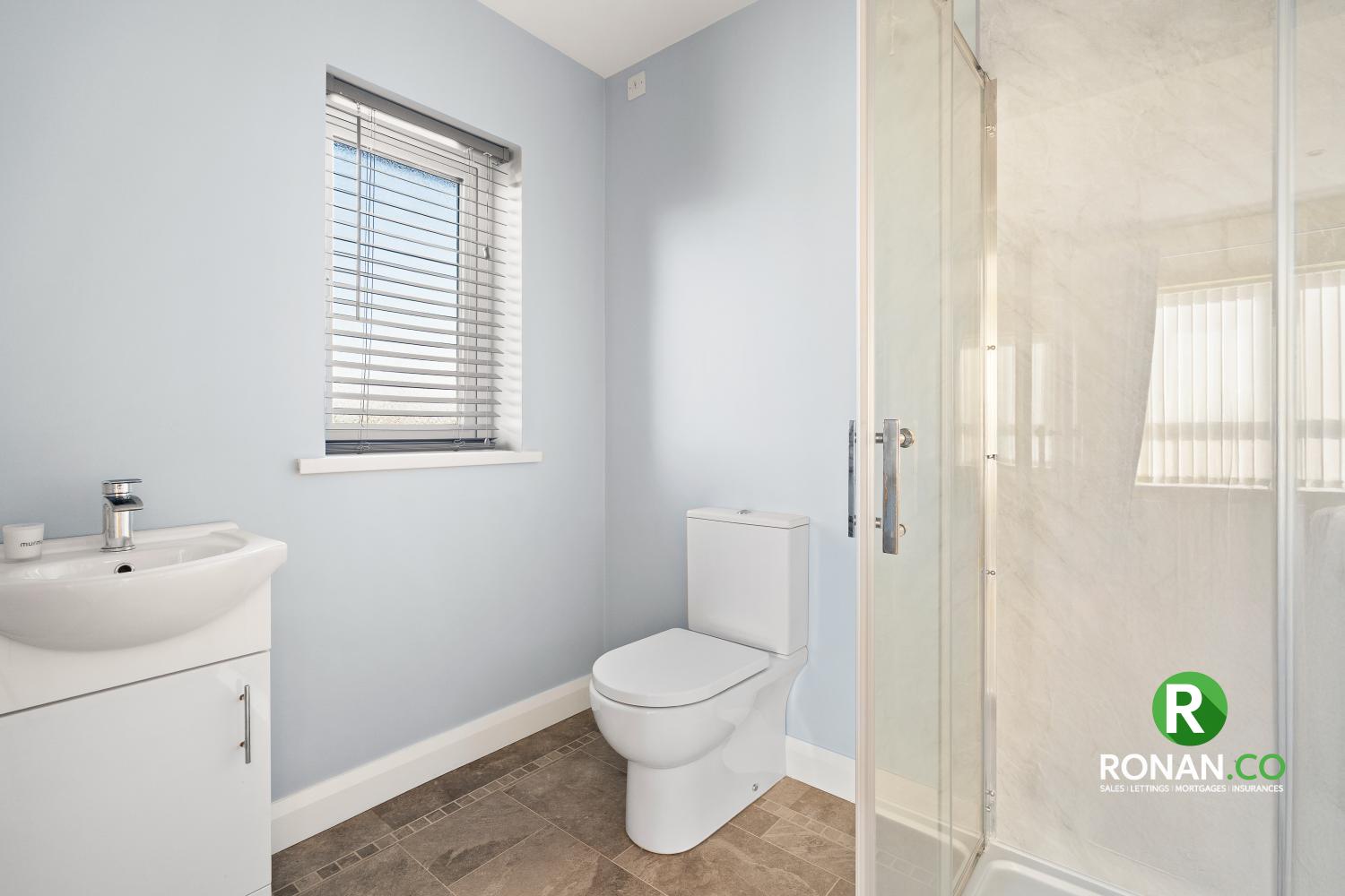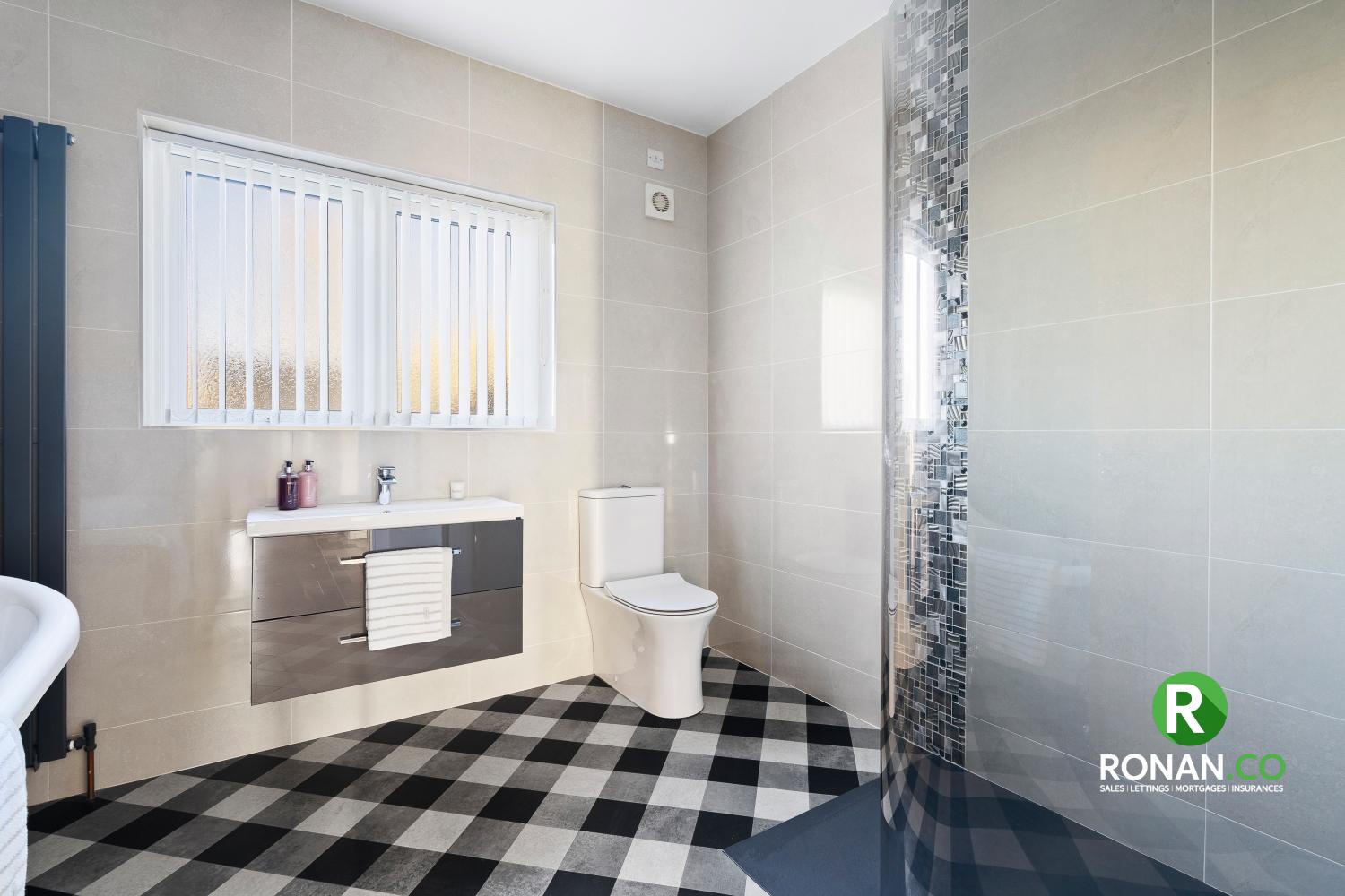 Karndane Flooring, WC, WHB, Power Shower, LED Spots, Chrome Towel Rail