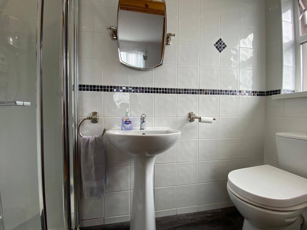 Comprising walk in electric shower with PVC cladding to walls, whb and wc, fully tiled walls, laminated wooden floor.