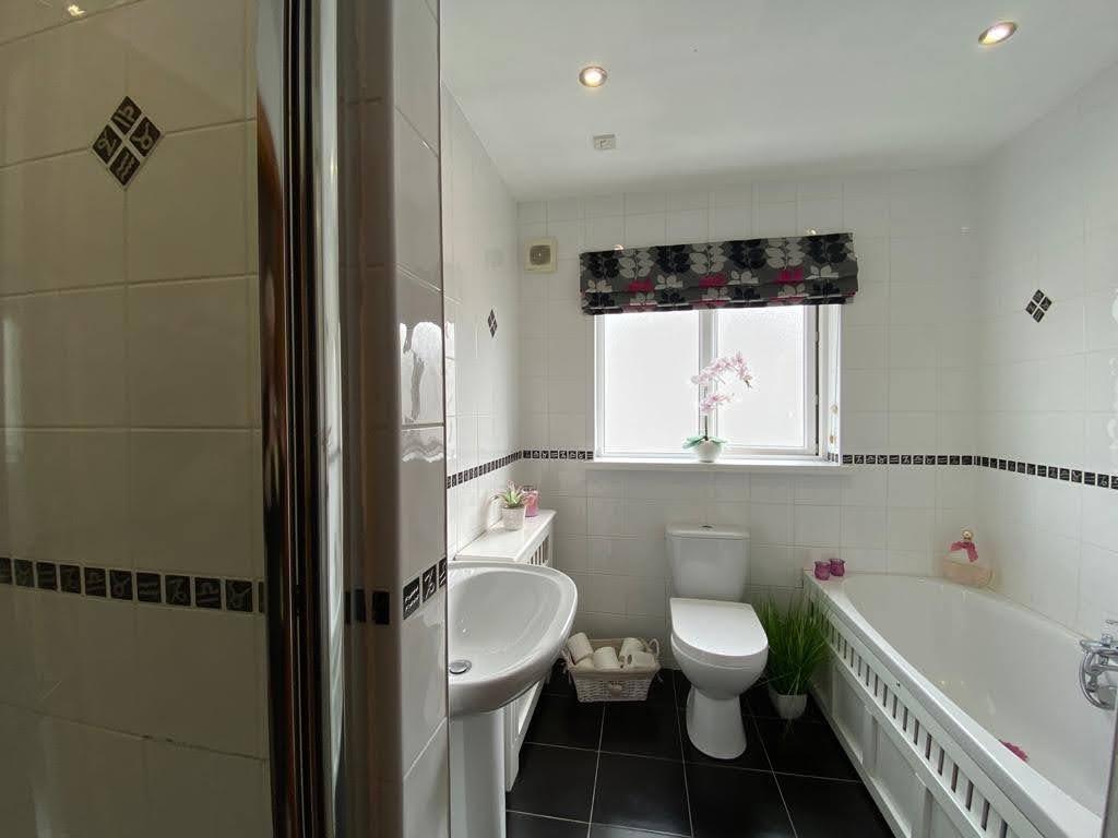 Comprising bath with shower fitting to taps, walk in power shower, whb and wc, fully tiled walls and floor.