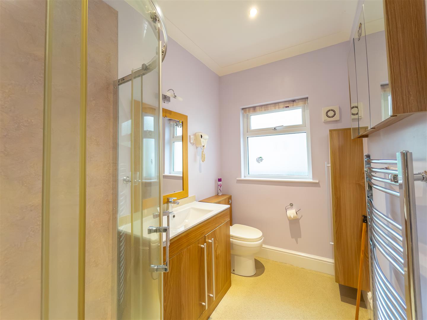 Shower Room - Housing shower cubicle with Triton Seville electric shower, low level W.C. and pedestal wash hand basin. There is access from the garage workshop into the covered swimming pool.