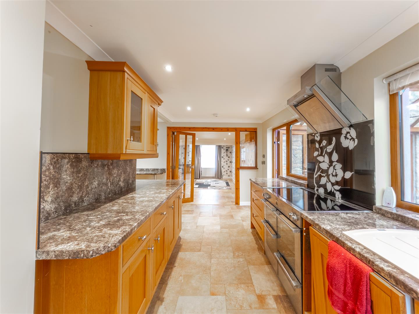 L-Shaped Kitchen - 5.82m (maximum) reducing to 2.06m (minimum) x 3.84 - With tiled floor fitted with a comprehensive range of stylish oak effect base and wall units including glazed display cabinets with roll top work surfaces over and matching splash backs. Composite sink and drainer with mixer tap, space and point for fridge freezer, integrated dishwasher, Stoves range style oven with brushed steel filter and light over, radiator, breakfast bar area, window to side and rear and glazed door to rear lobby. Glazed concertina style doors connecting to the dining room.