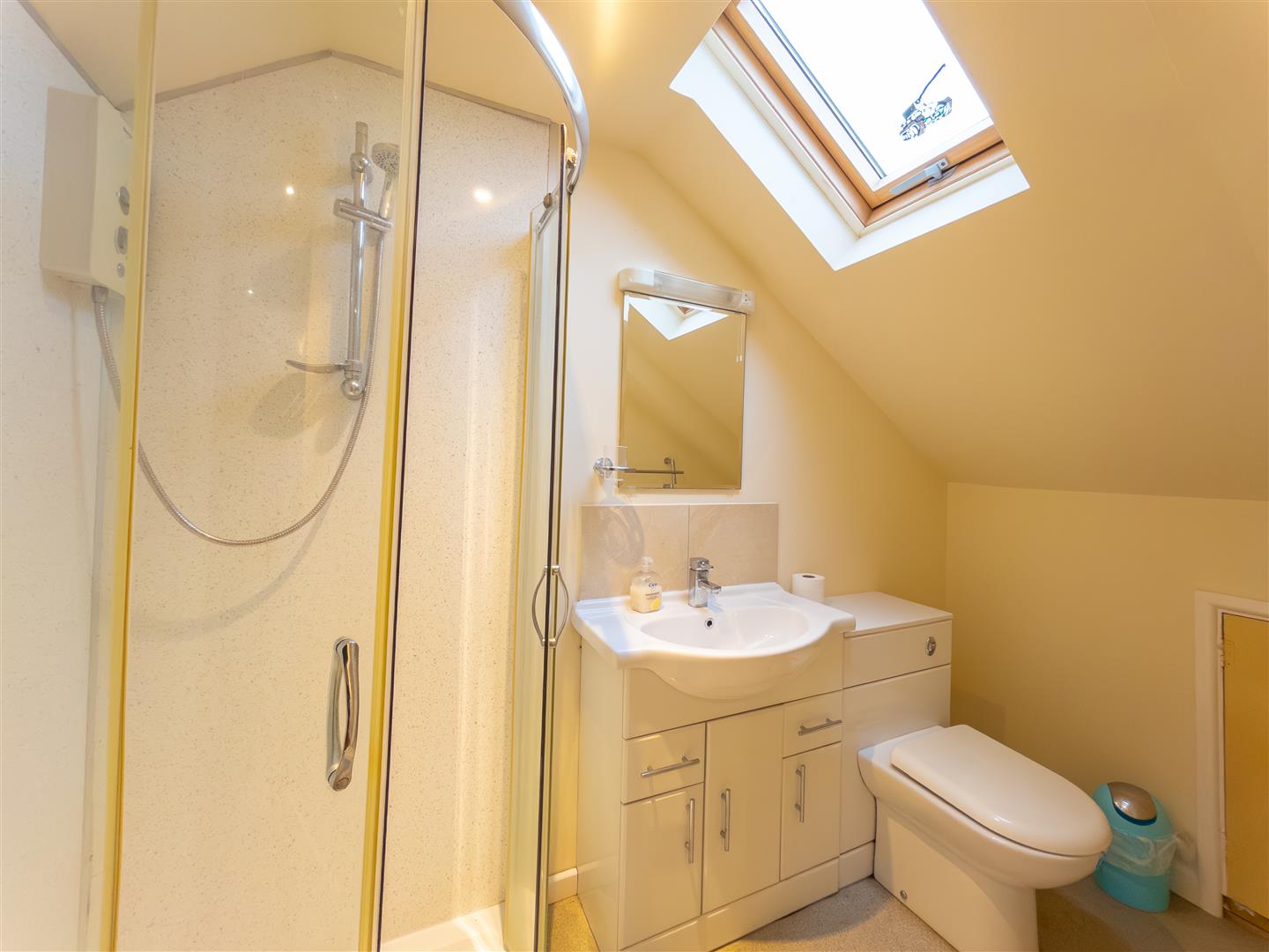 En Suite - 2.62m x 1.40m (8'7" x 4'7") - With corner cubicle with aqua panelling housing a electric shower, wash hand basin and concealed cistern W.C. in vanity unit with storage below, chrome effect ladder style radiator, access to eaves storage and Velux style window.