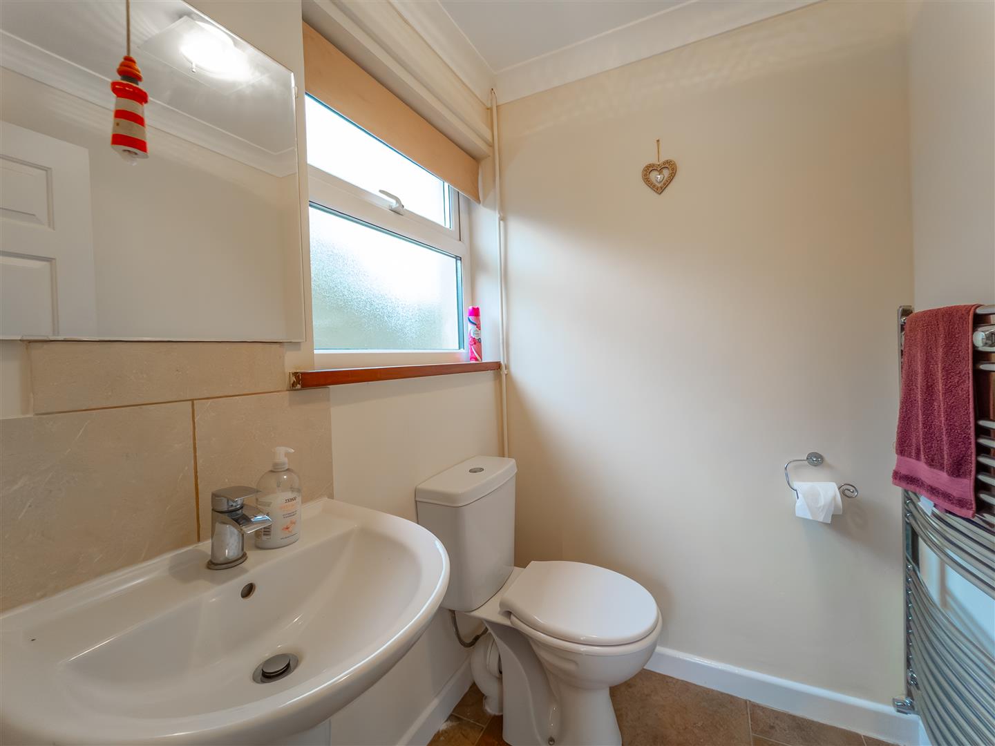 Cloakroom - 4'9" x 4'4" - Low level W.C., pedestal wash hand basin, chrome effect ladder style radiator, obscured window to side.