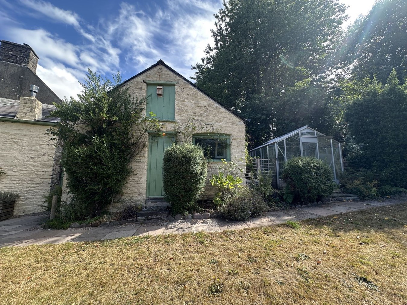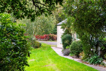 Outside, the setting is a delightful oasis. Accessed via a private road shared with the neighbour, a gated parking area welcomes you home, with a charming curved cobbled entrance leading to the house and workshop. The gardens are a true treat, with lawns rolling gently down to the river’s edge, framed by a variety of established shrubs, flower borders and mature trees. There are also the remains of an old stone bridge, adding a touch of romance and history to the landscape, as well as a peaceful wooded area teeming with wildlife. Practicality meets charm with a greenhouse, a substantial stone outbuilding (5.57m x 4.64m) with vaulted ceiling, power, lighting, plumbing and a toilet which is ideal as a utility space or for creative projects. Attached to the house is a spacious store/workshop (5.37m x 4.08m and 5.50m x 4.79m) with overhead storage, alongside a garage (4.65m x 2.32m) with a metal up-and-over door.